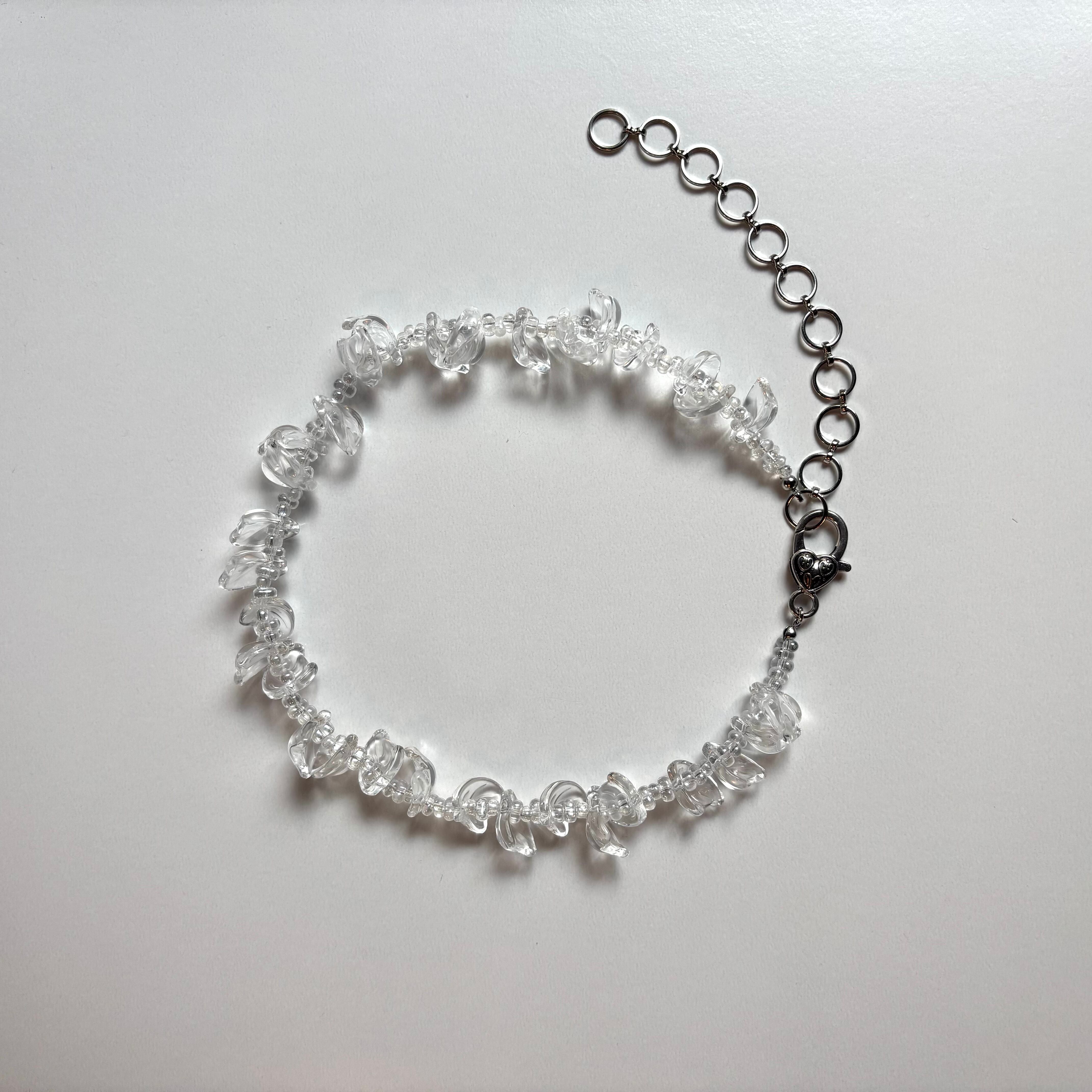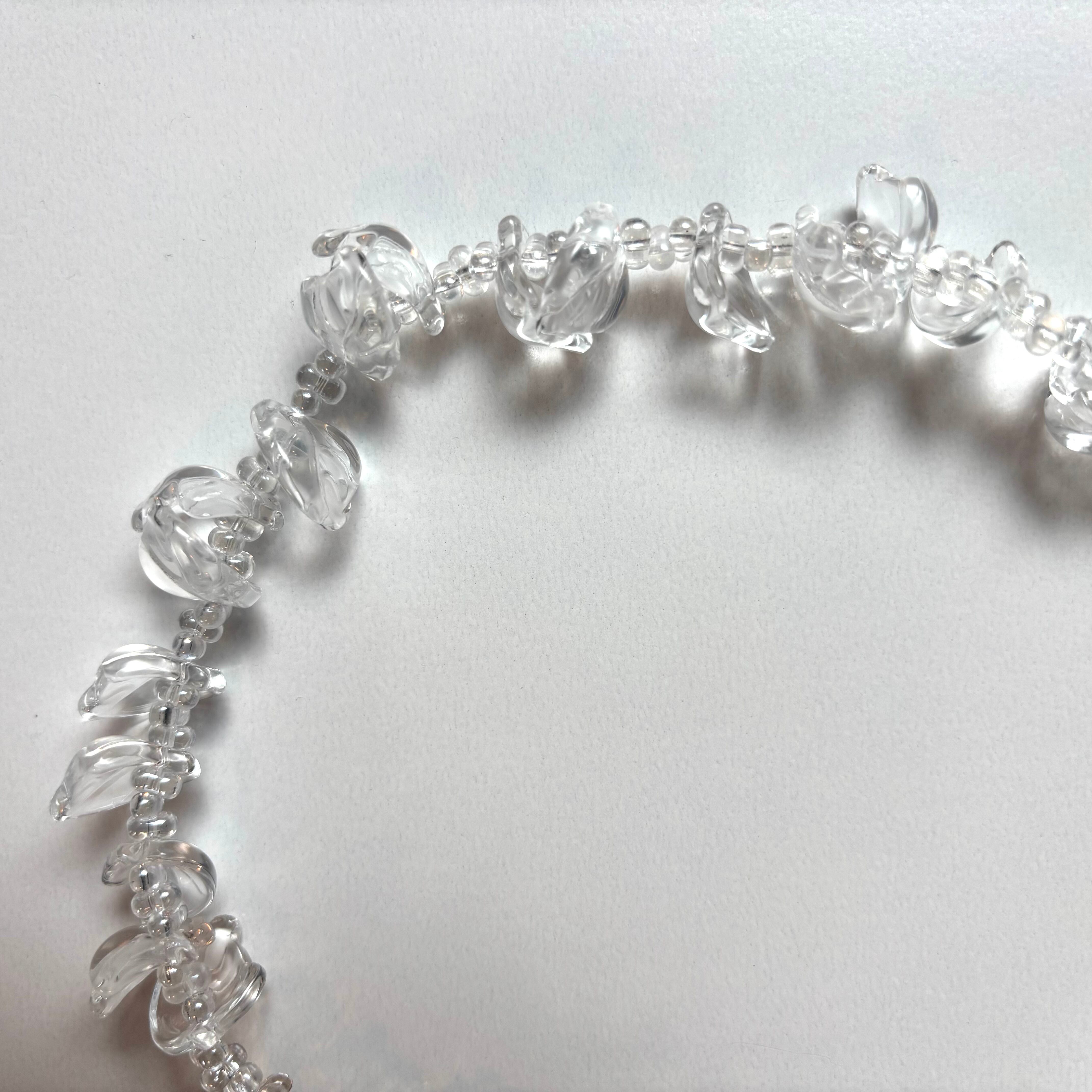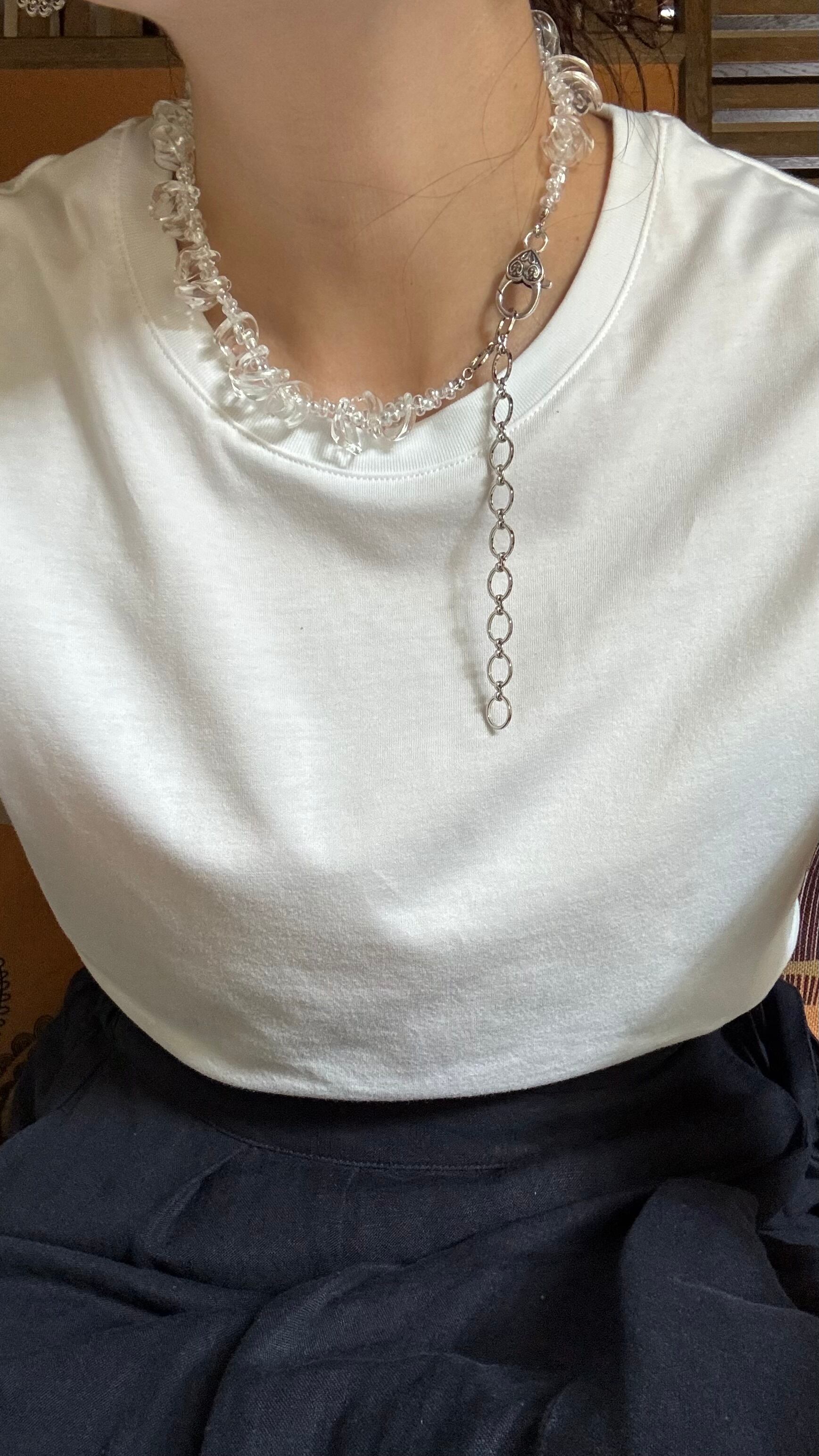 こちらは花びら型のクリアなアクリルビーズを使って製作いたしました。どんなお洋服にも合わせやすくアジャスターで長さ調整も可能です。ぜひ夏のコーディネートに取り入れていただきたいネックレスです。