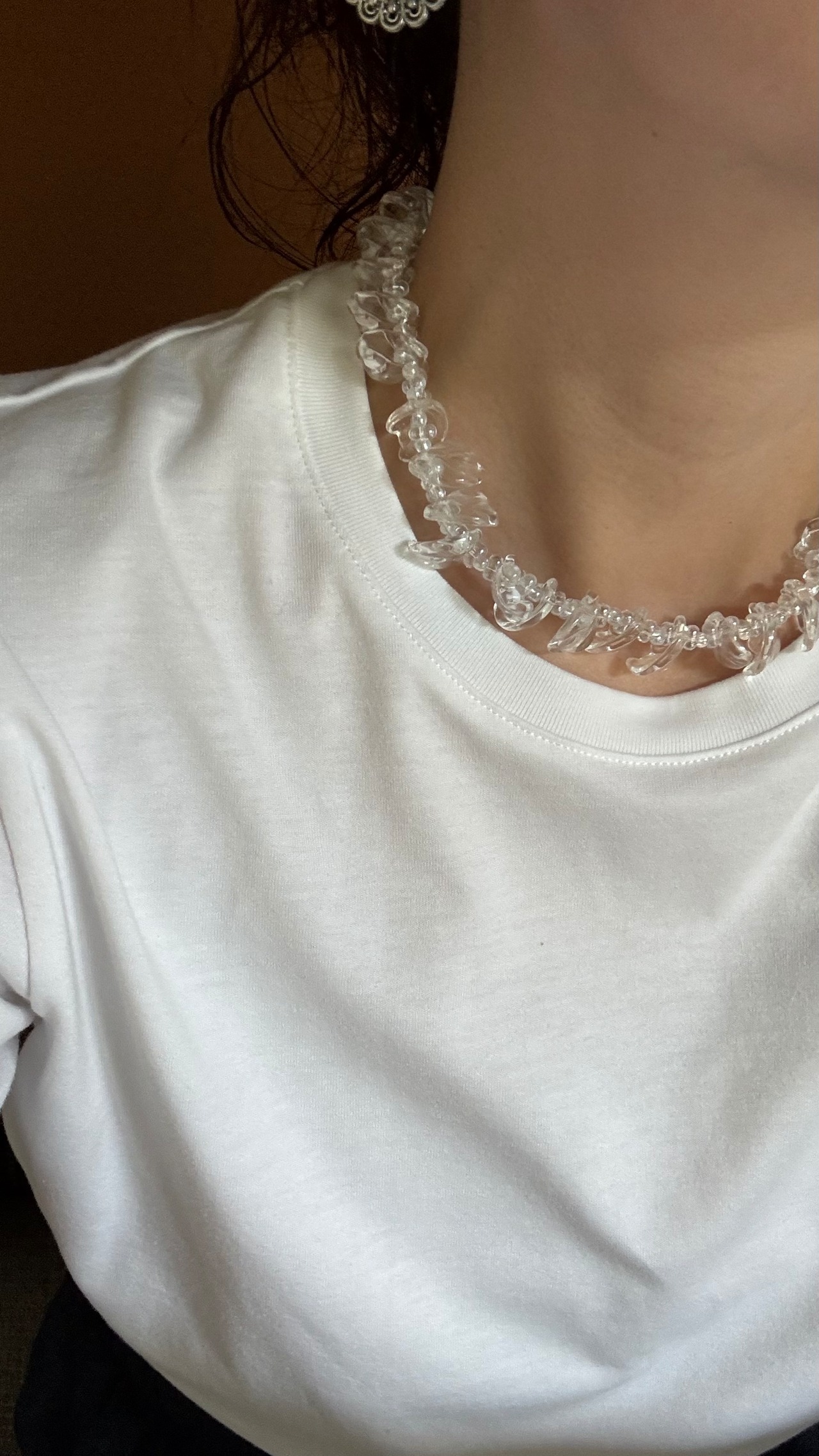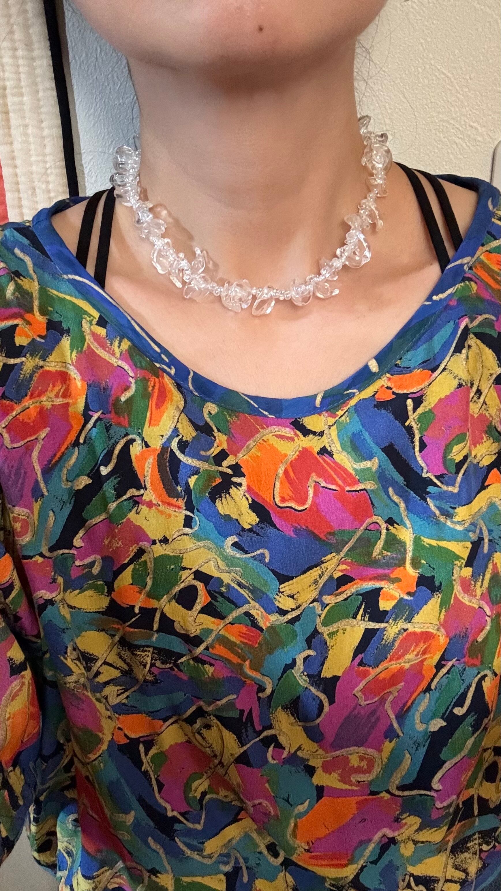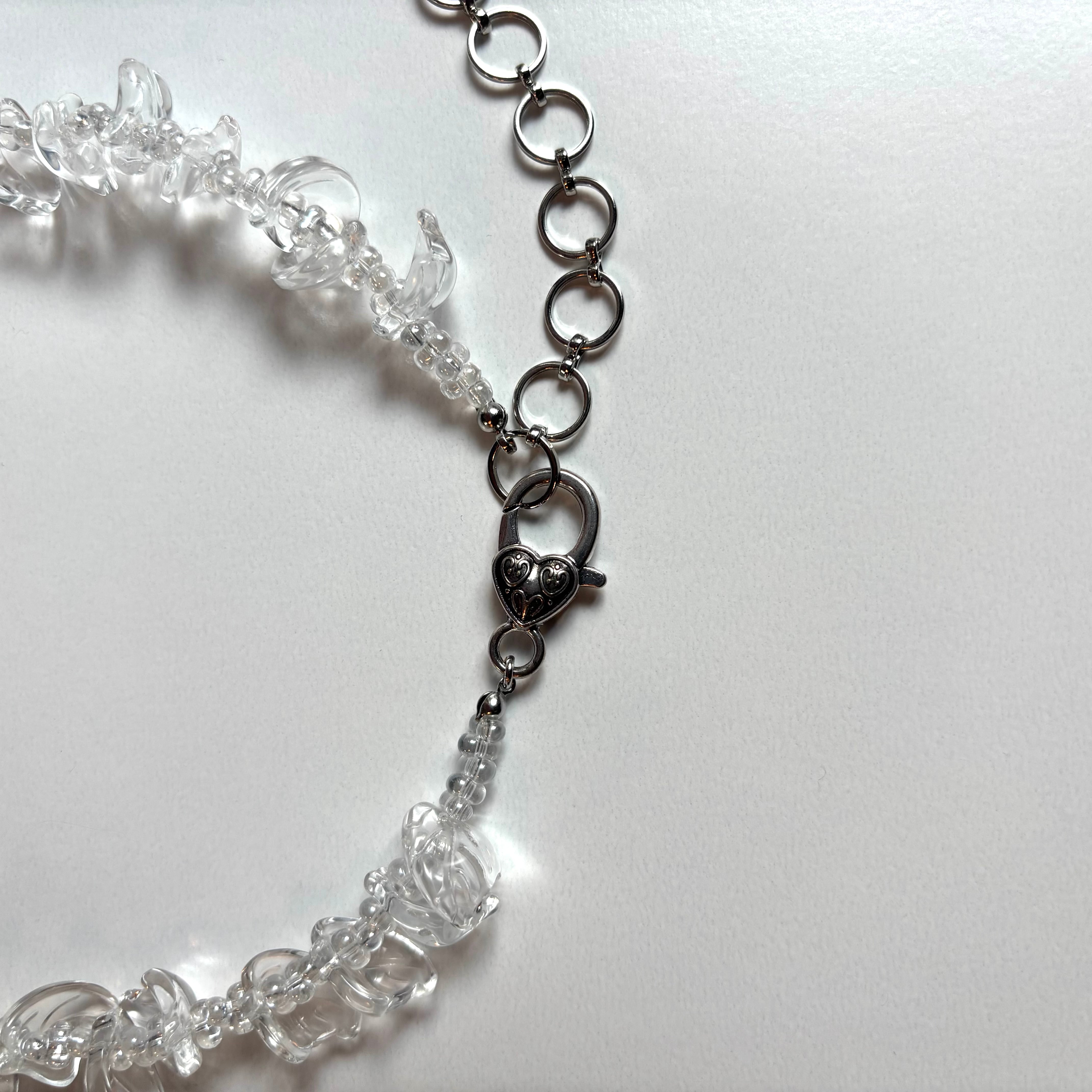 こちらは花びら型のクリアなアクリルビーズを使って製作いたしました。どんなお洋服にも合わせやすくアジャスターで長さ調整も可能です。ぜひ夏のコーディネートに取り入れていただきたいネックレスです。