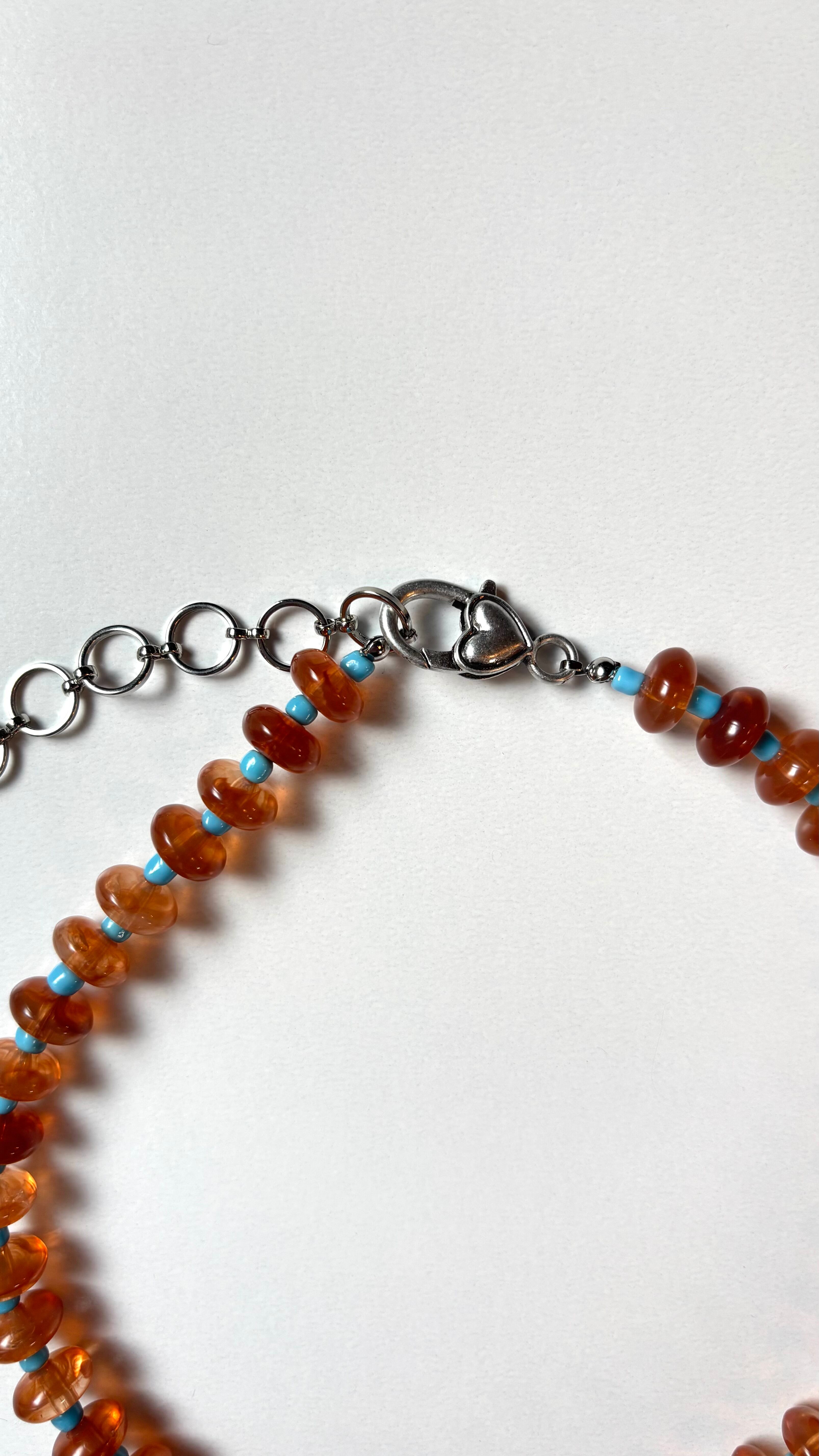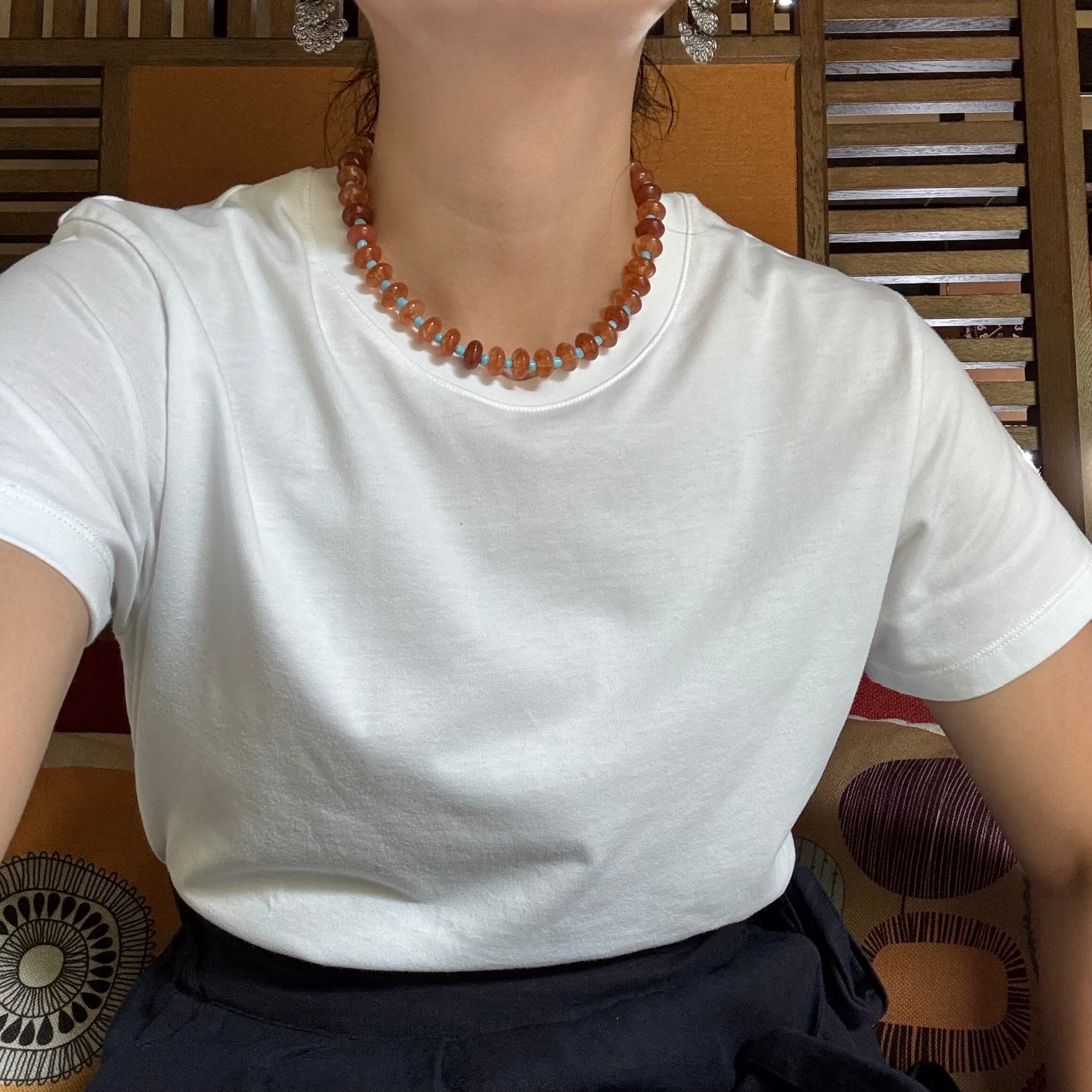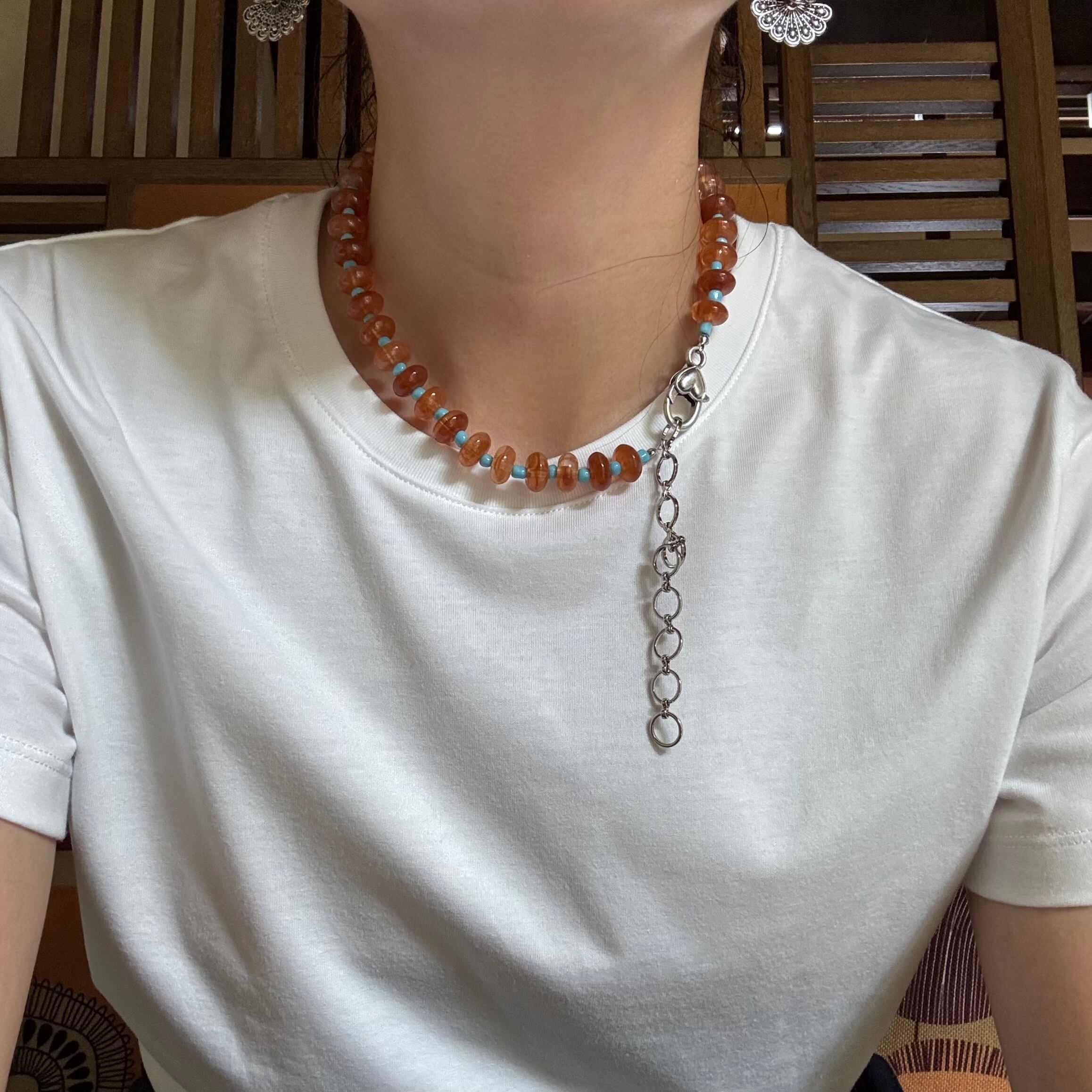 太陽の光を受けた時の見え方が魅力的なネックレスです。こちらはクリアなサーモンピンクに水色のガラスビーズを間に入れたデザインになります。