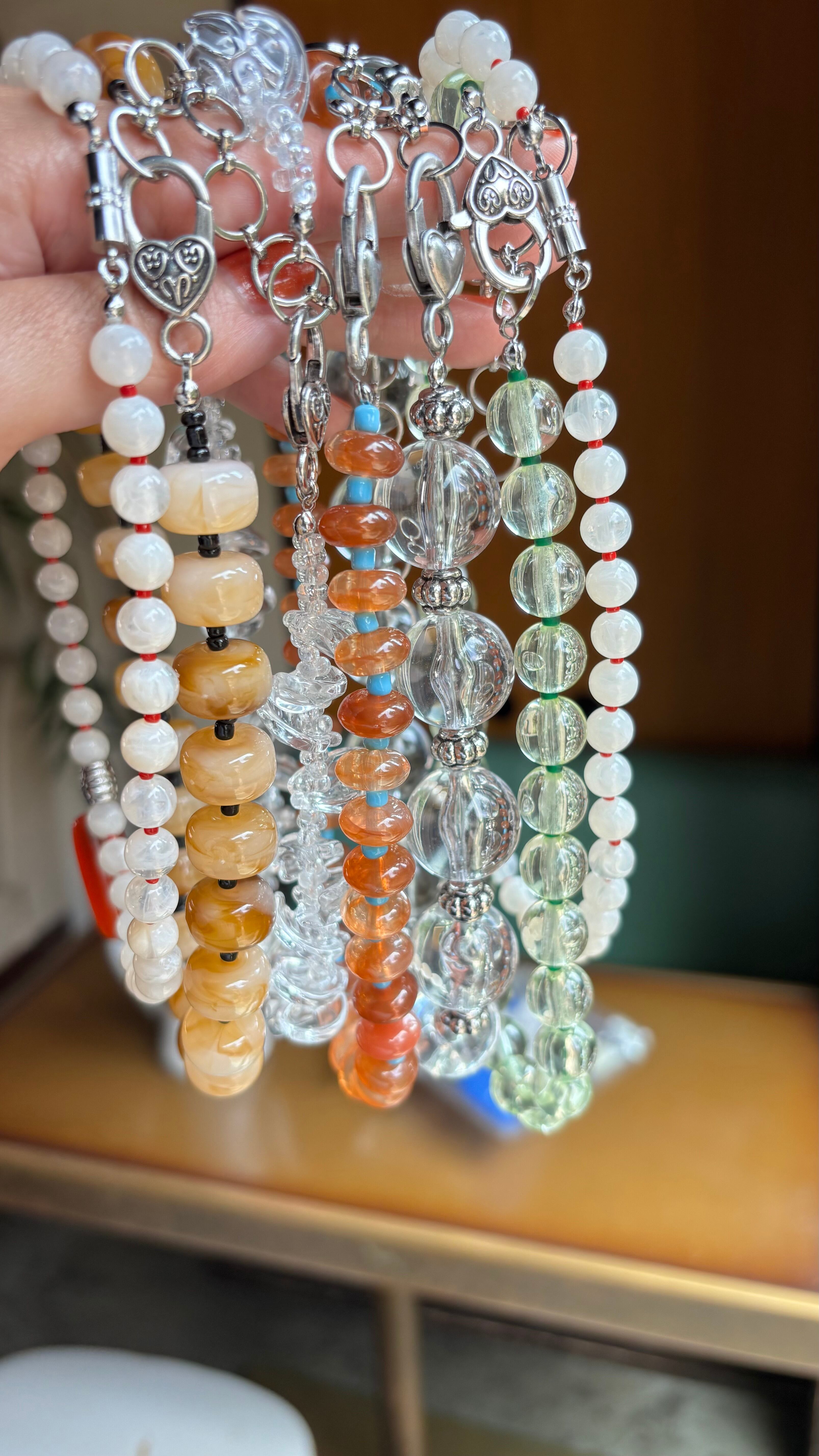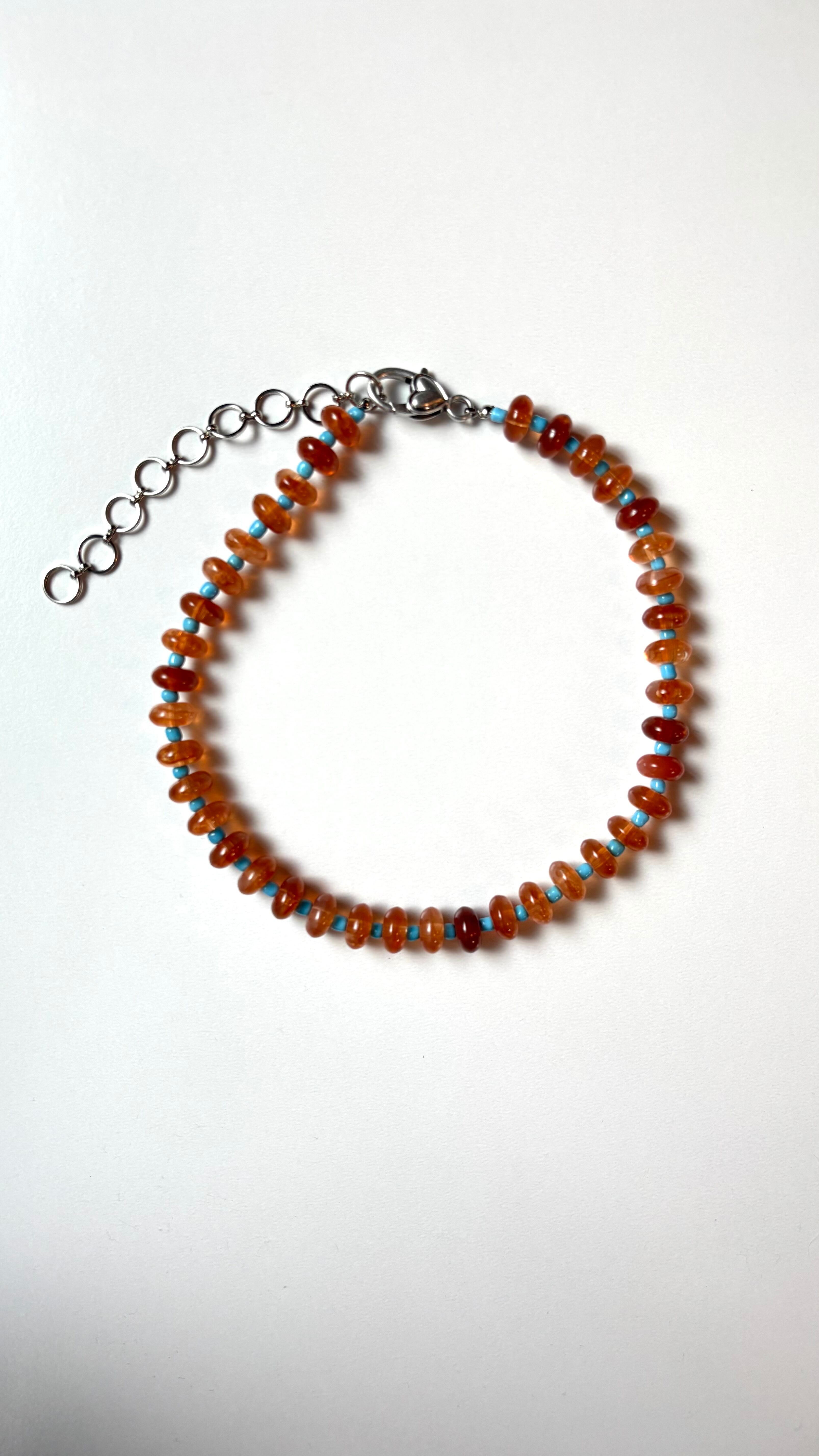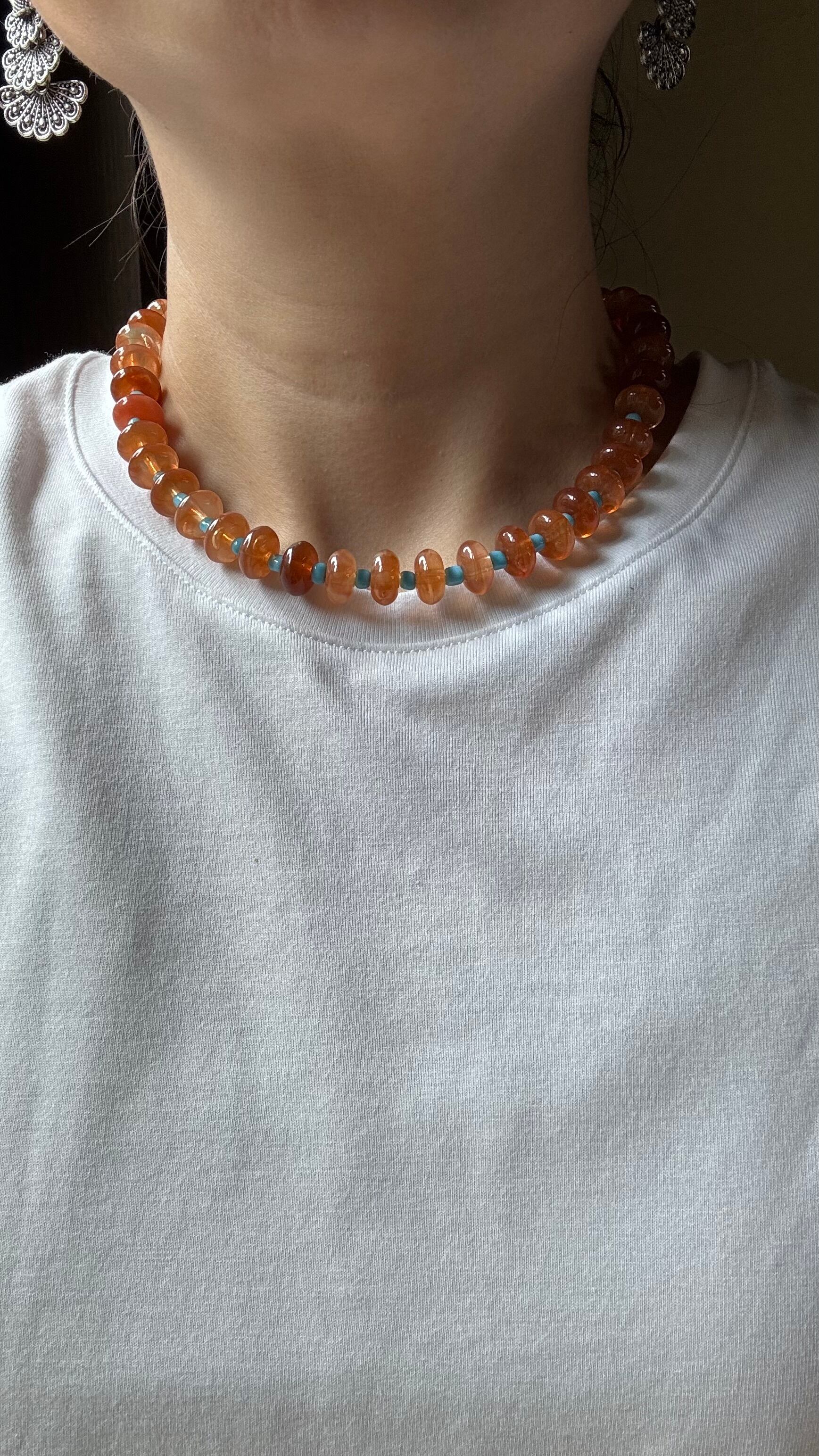 太陽の光を受けた時の見え方が魅力的なネックレスです。こちらはクリアなサーモンピンクに水色のガラスビーズを間に入れたデザインになります。