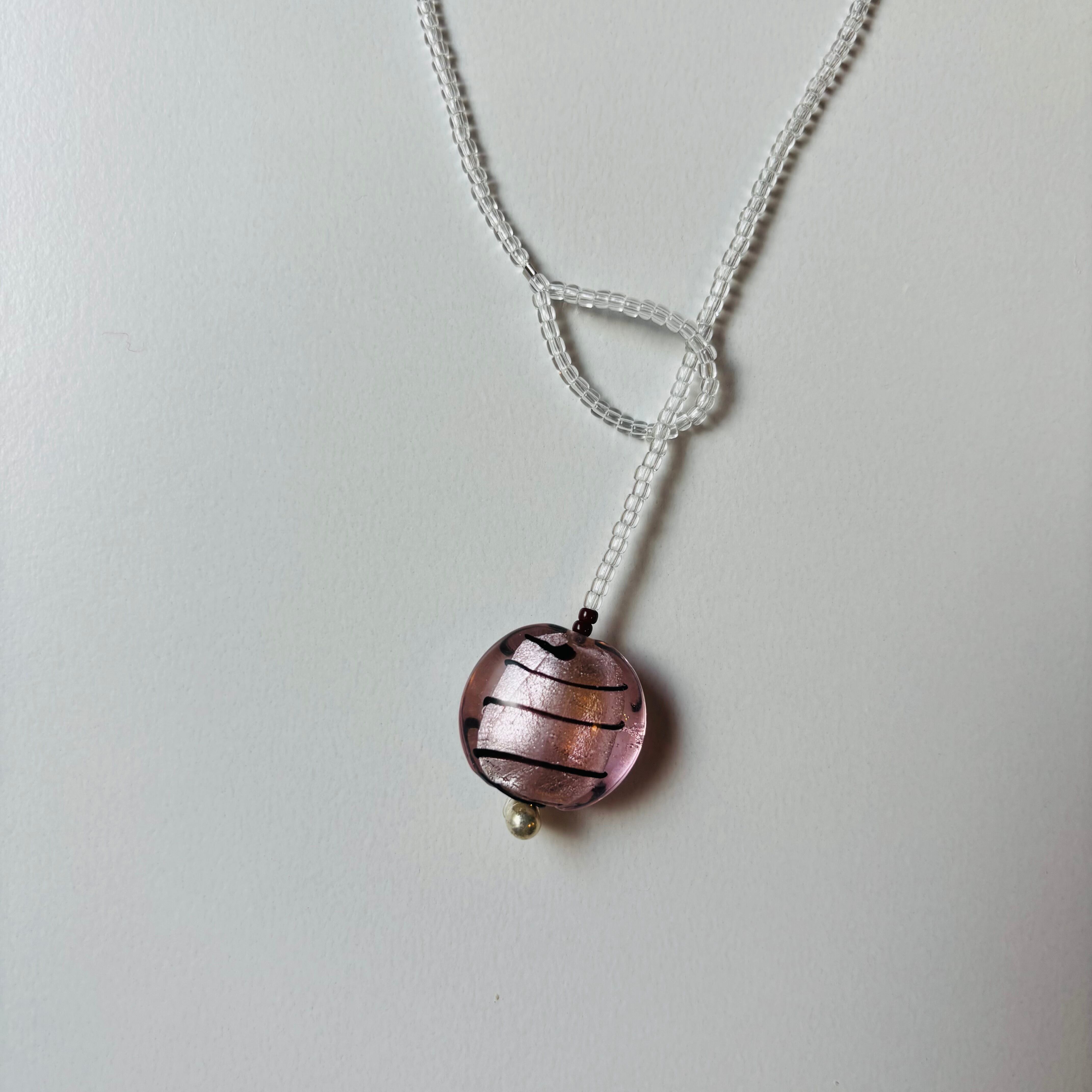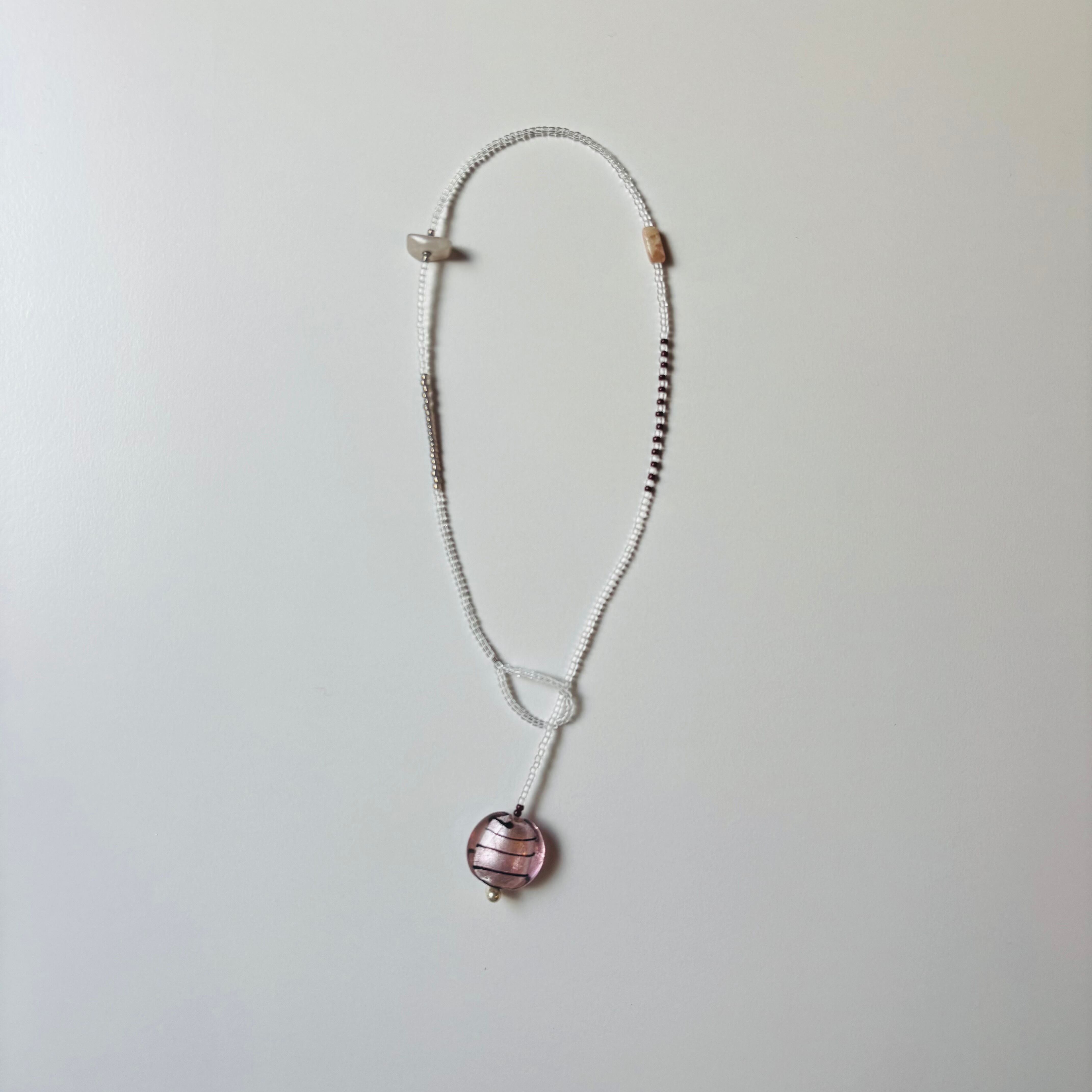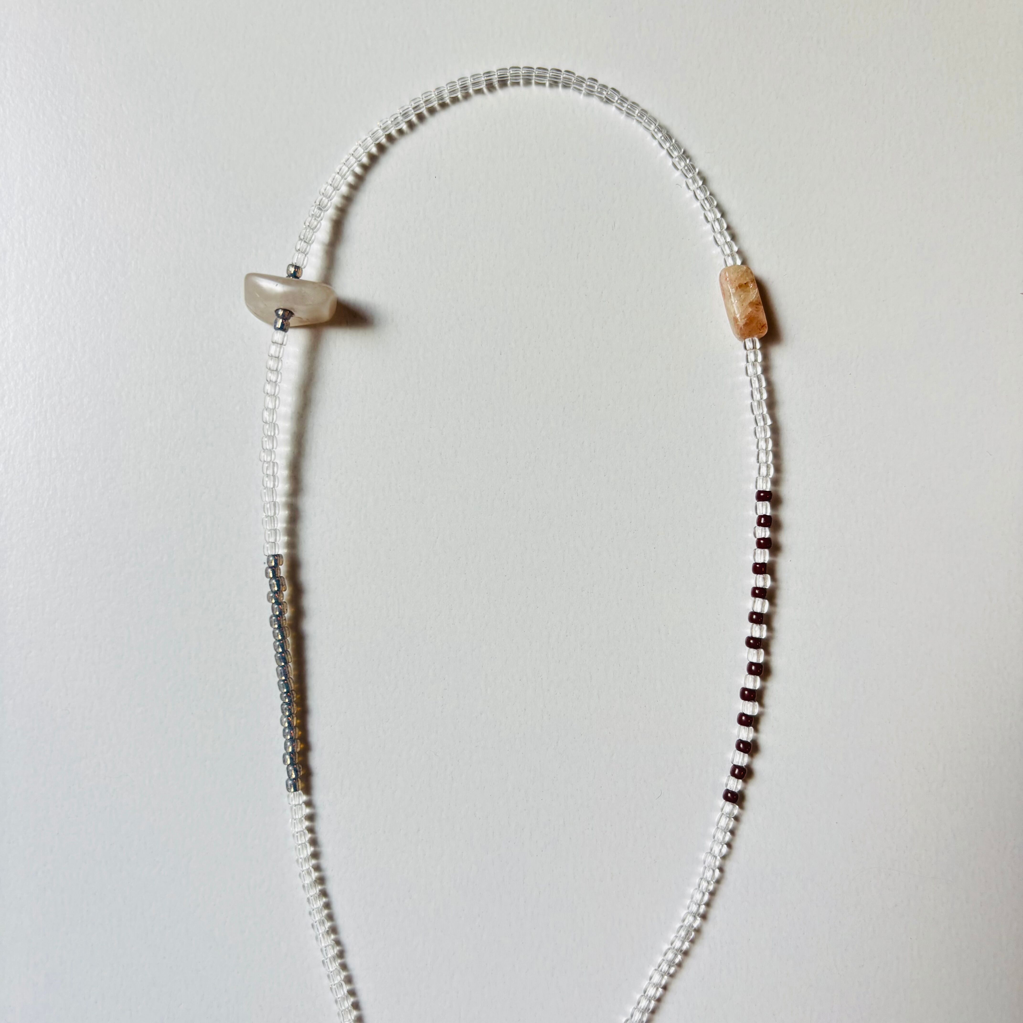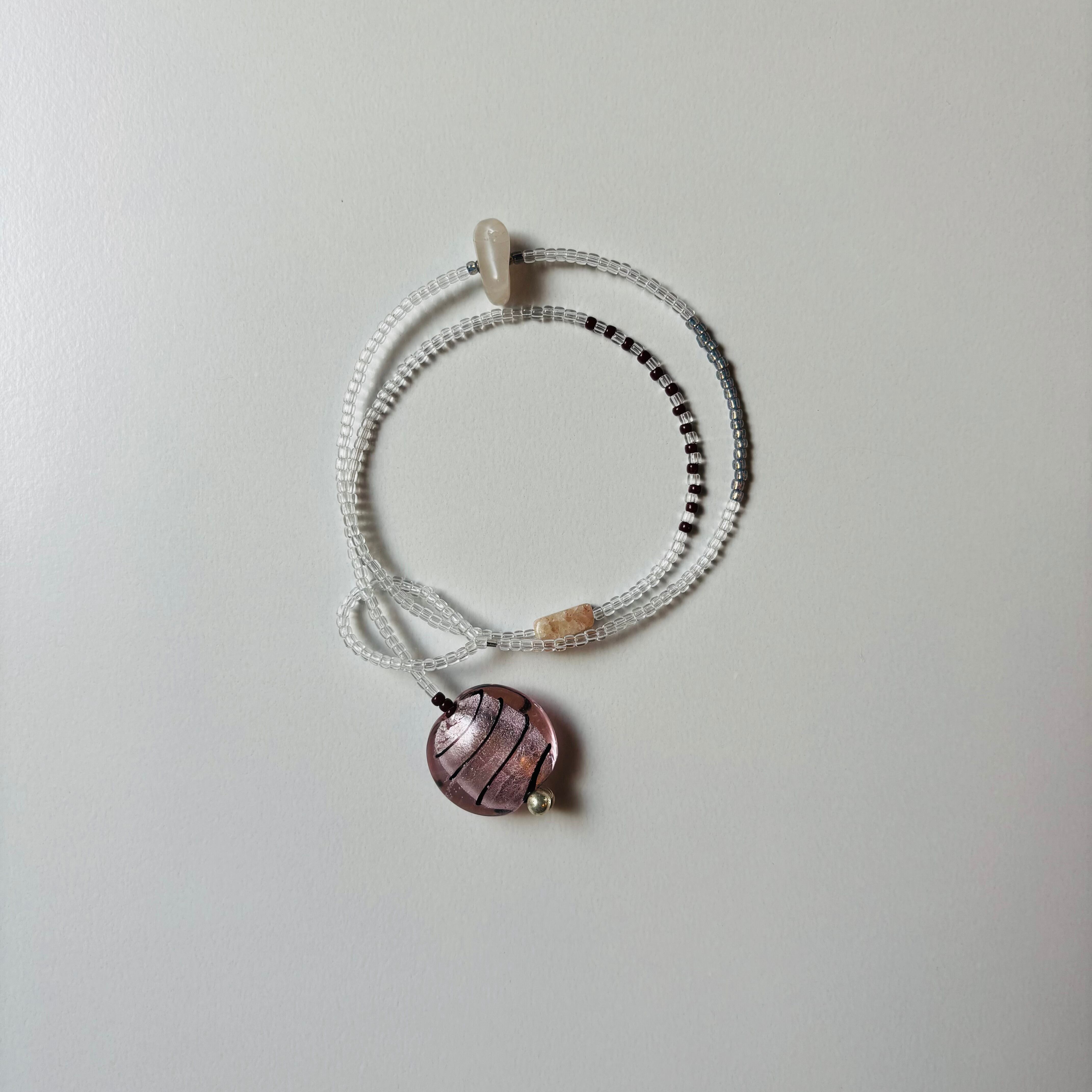 メインに使っているビーズはインドやアジアのもので、日本製のクリアなガラスビーズの間にバランスを見て配置しております。丸い穴にトップのビーズを通して着用するので簡単で、トップを後ろに持ってきても後ろ姿が可愛くなるし、前から見ても違ったデザインで楽しんでいただけます。また二重に巻いてブレスレットとしてもお使いください。