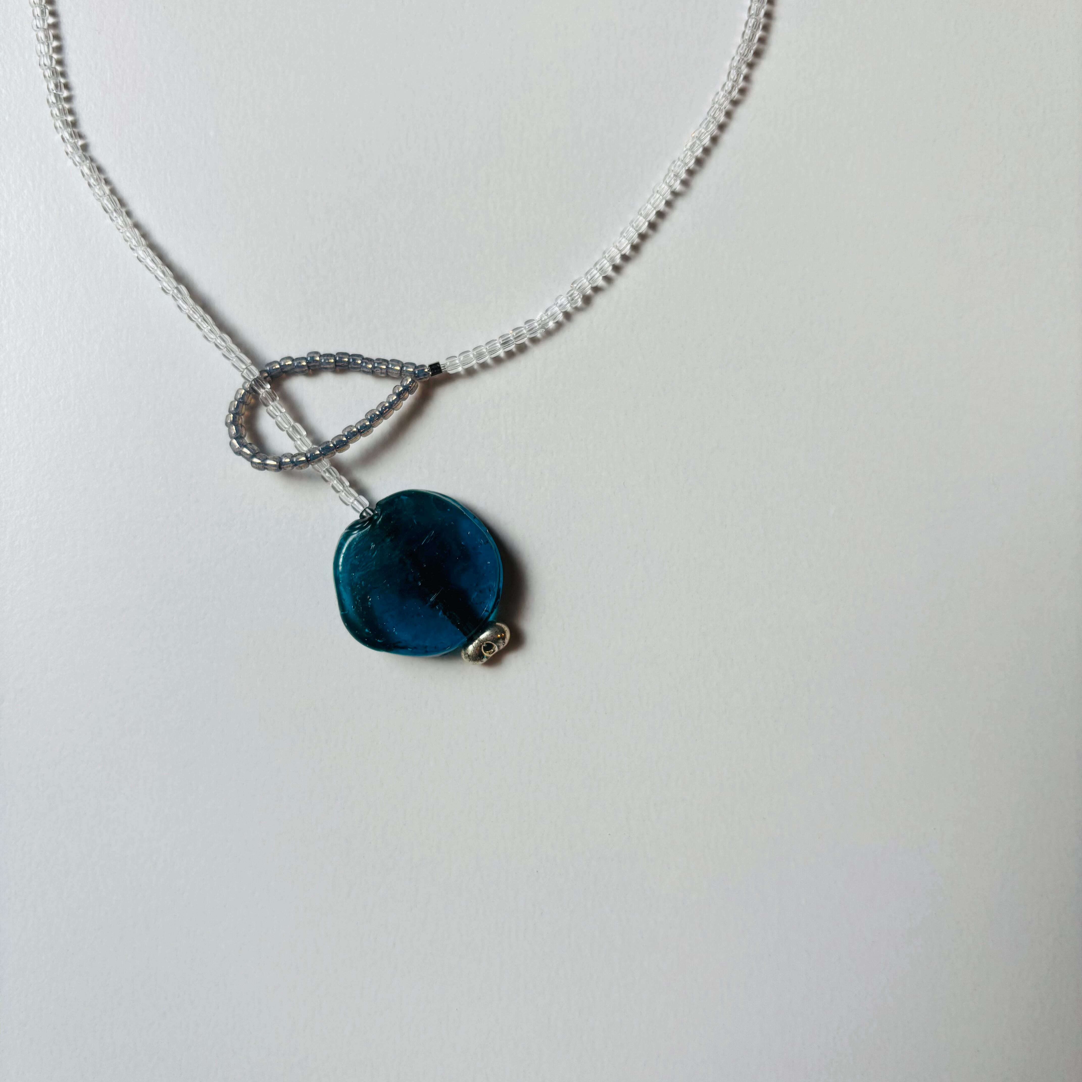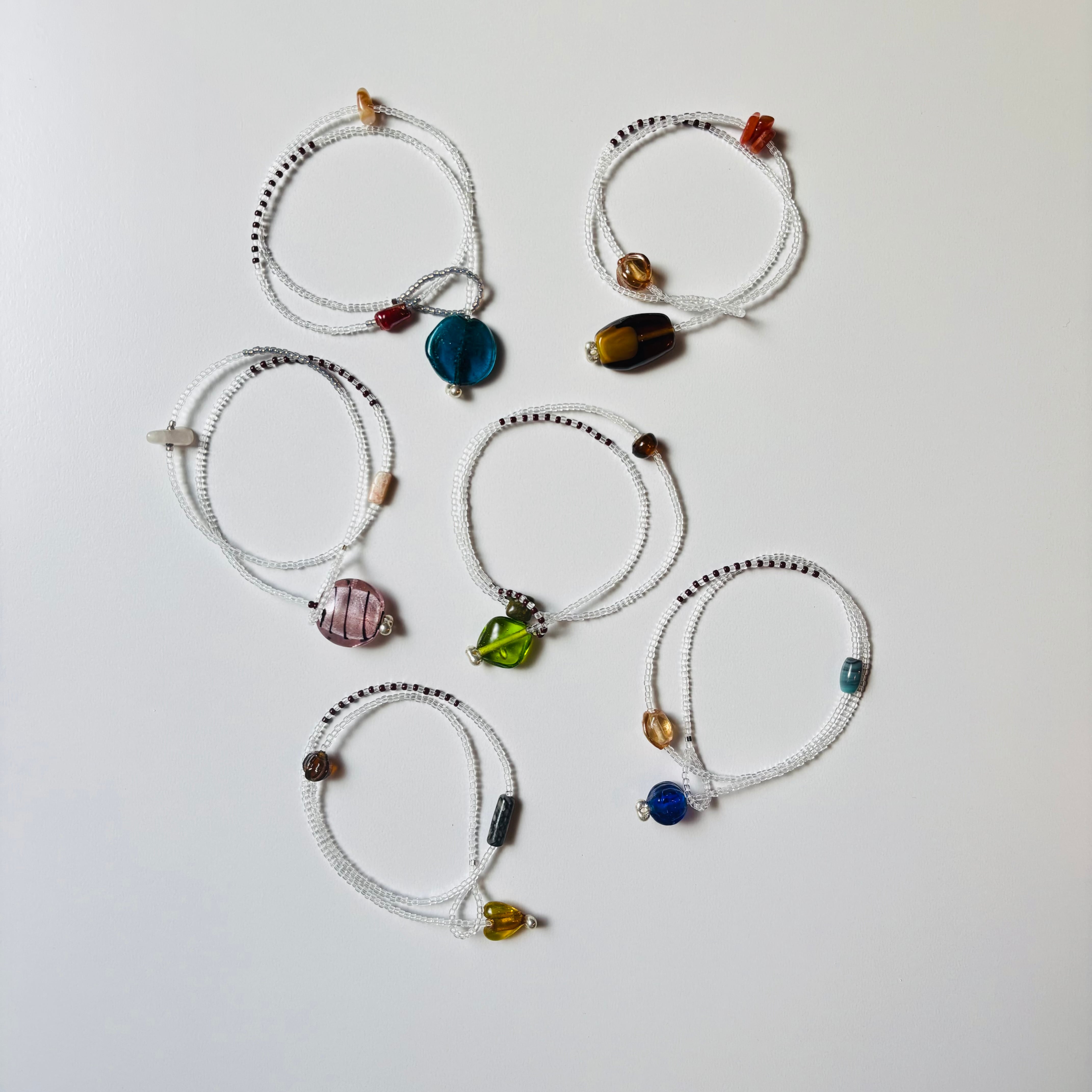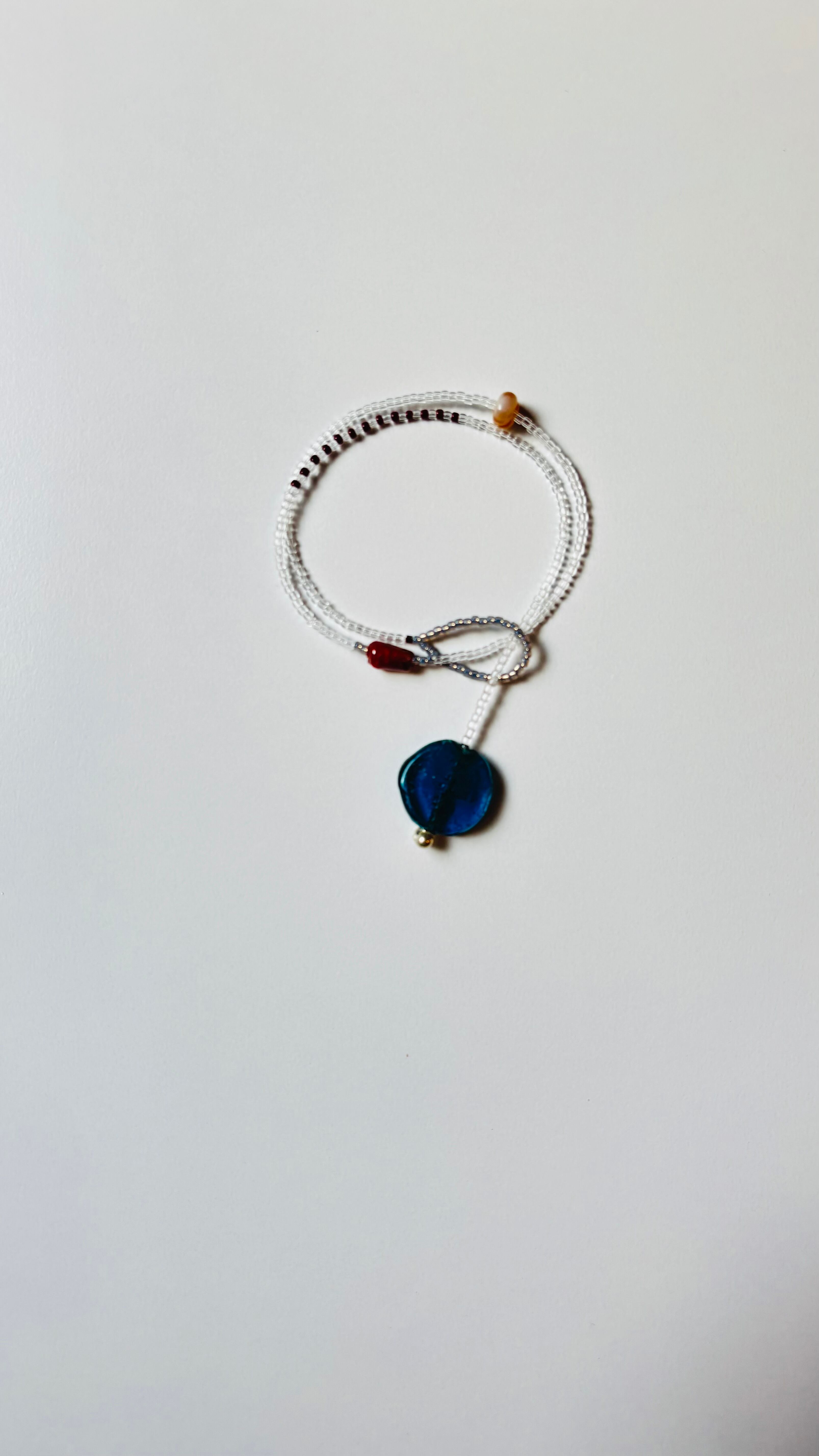 メインに使っているビーズはインドやアジアのもので、日本製のクリアなガラスビーズの間にバランスを見て配置しております。丸い穴にトップのビーズを通して着用するので簡単で、トップを後ろに持ってきても後ろ姿が可愛くなるし、前から見ても違ったデザインで楽しんでいただけます。また二重に巻いてブレスレットとしてもお使いください。