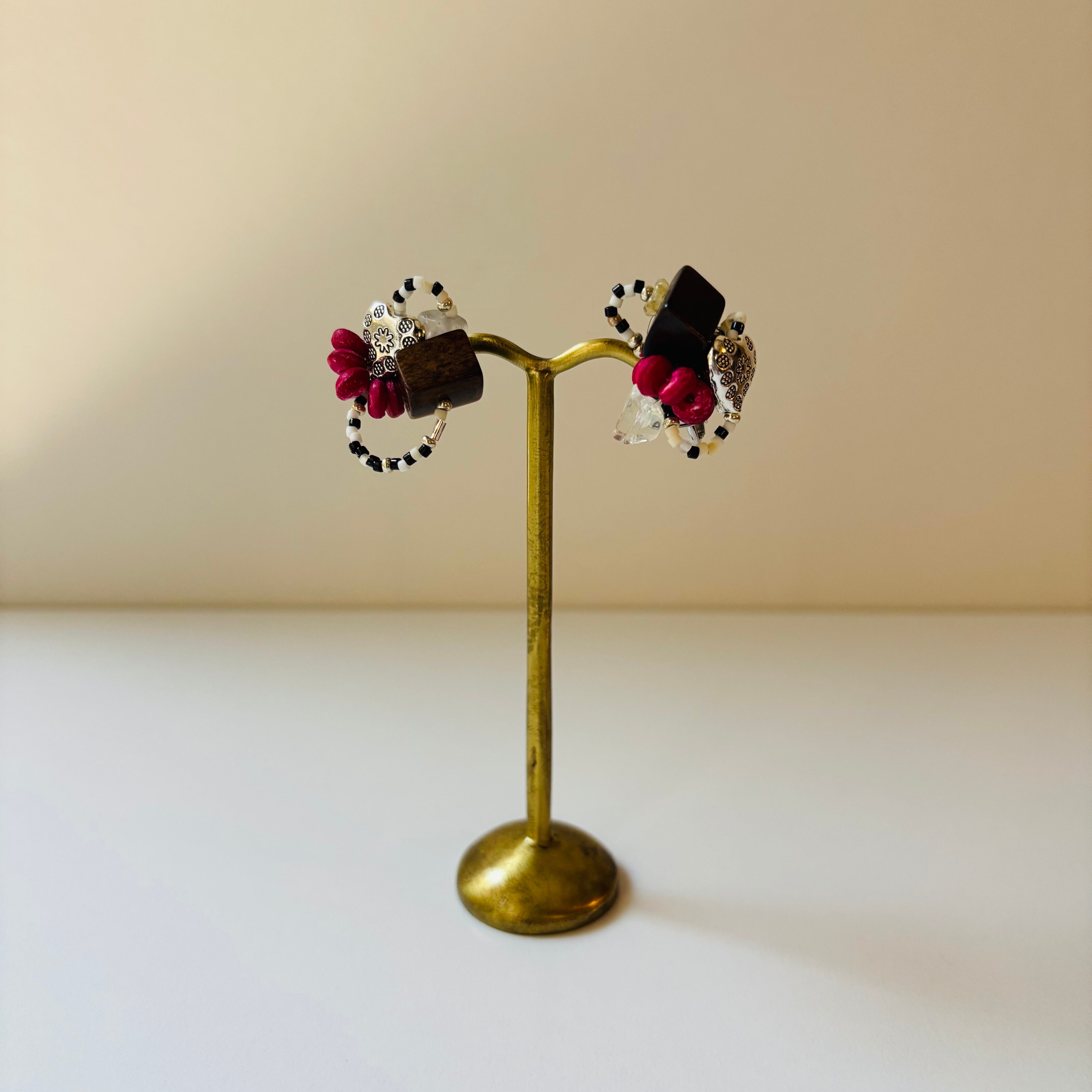 土台にコラージュするようにビーズを縫い付けています。パーツの素材や色のバランスを見ながら作る、すべて一点もののイヤリングになります。