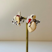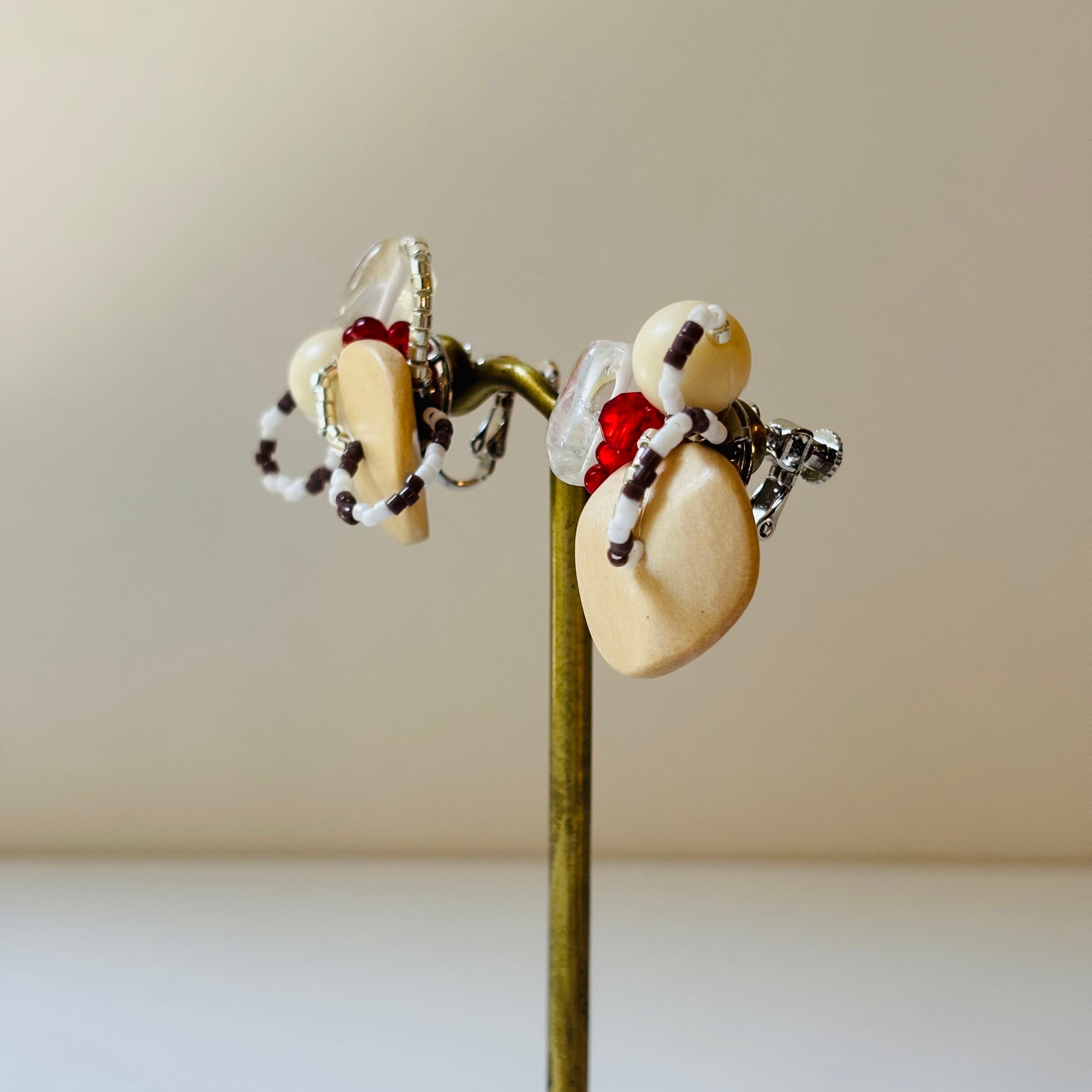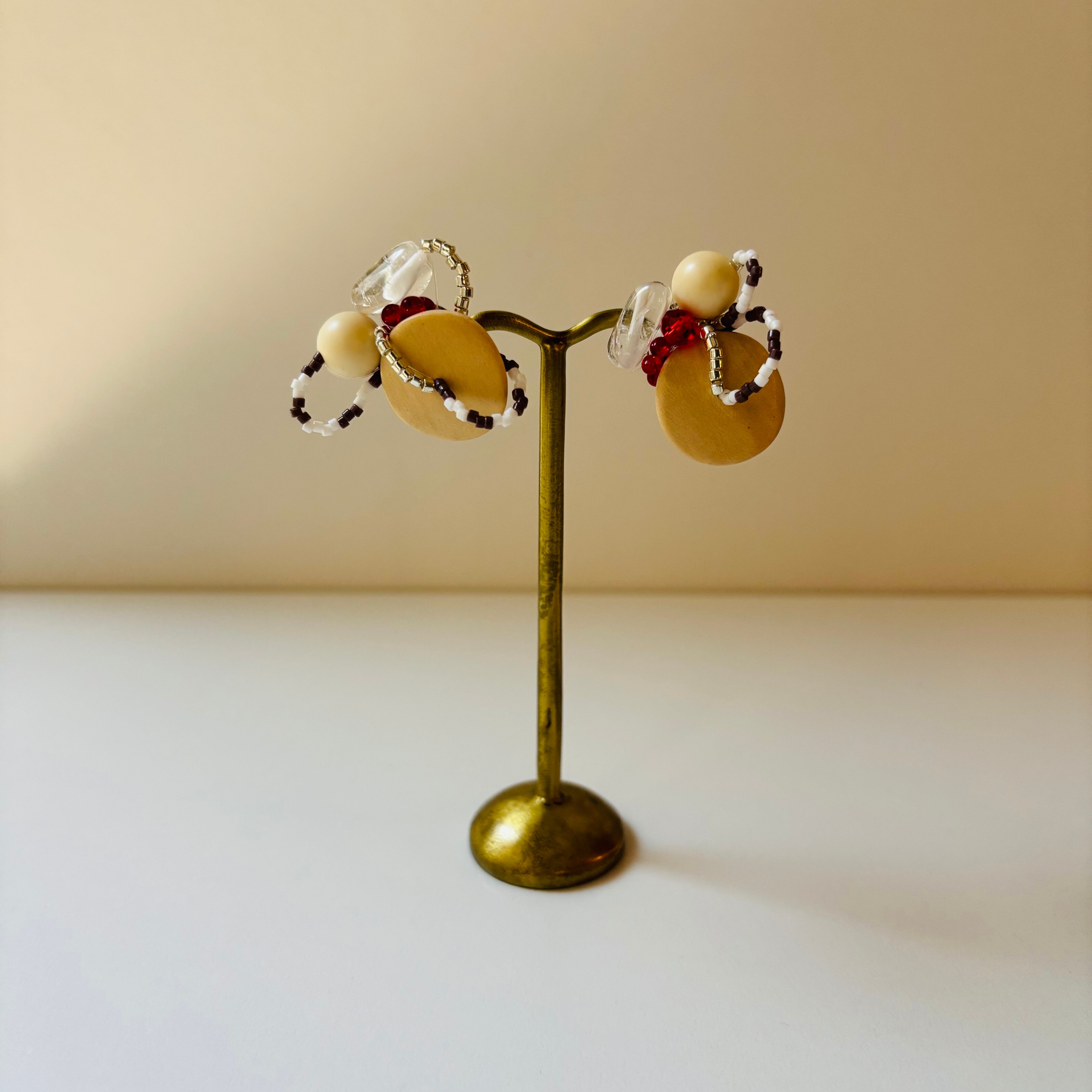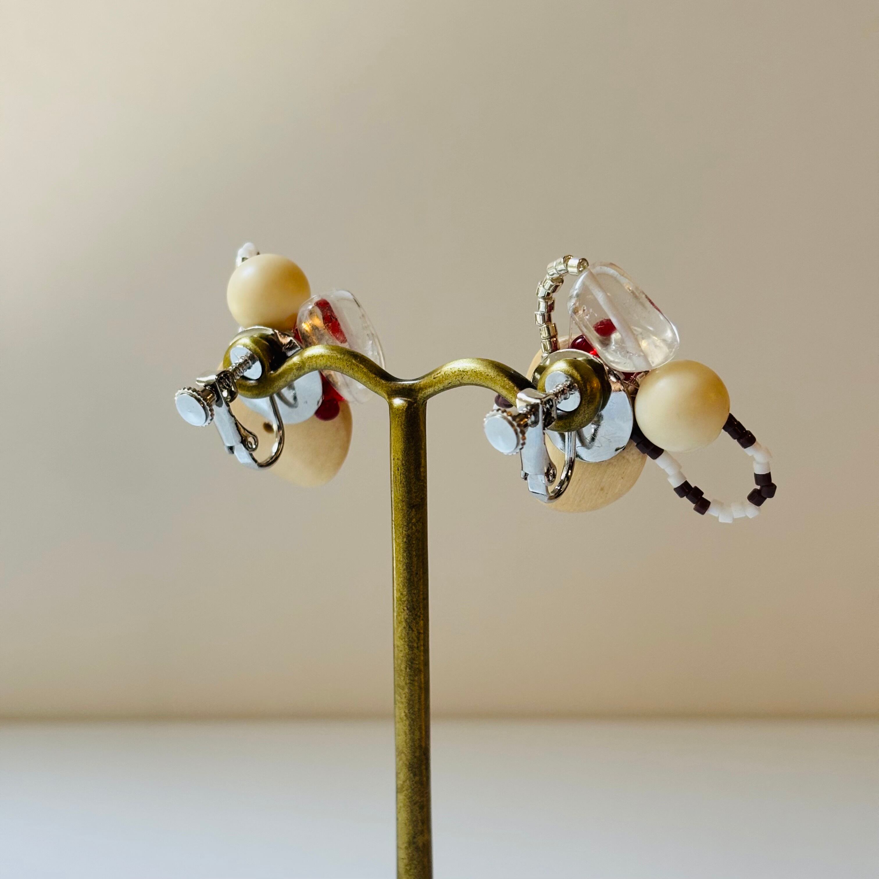 土台にコラージュするようにビーズを縫い付けています。パーツの素材や色のバランスを見ながら作る、すべて一点もののイヤリングになります。