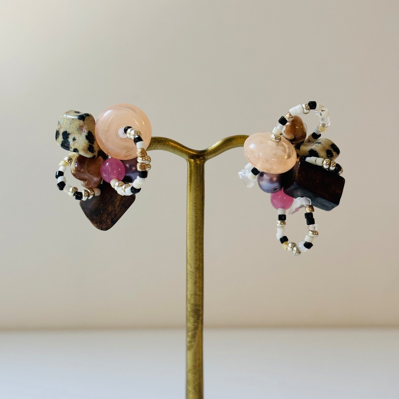 土台にコラージュするようにビーズを縫い付けています。パーツの素材や色のバランスを見ながら作る、すべて一点もののピアスになります。