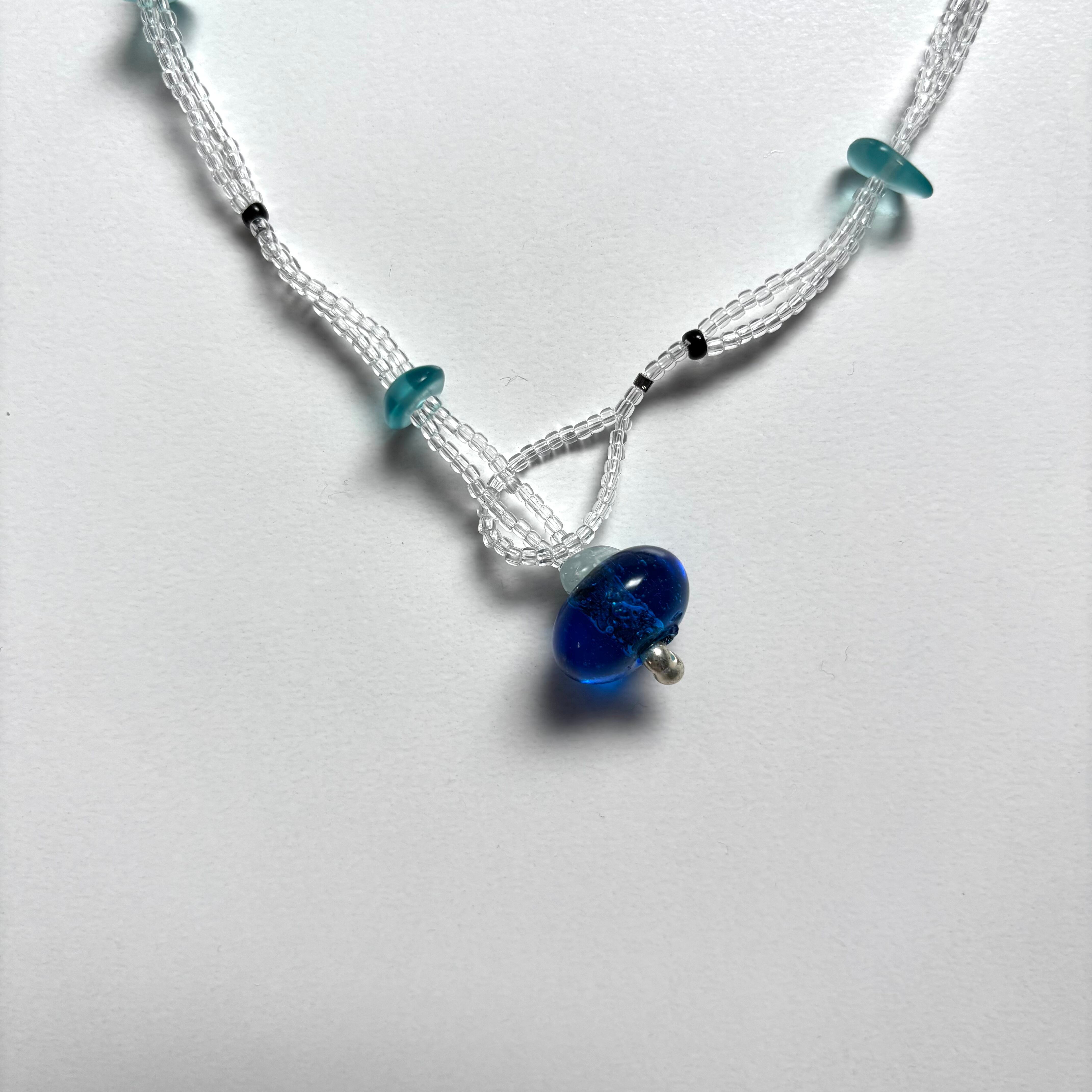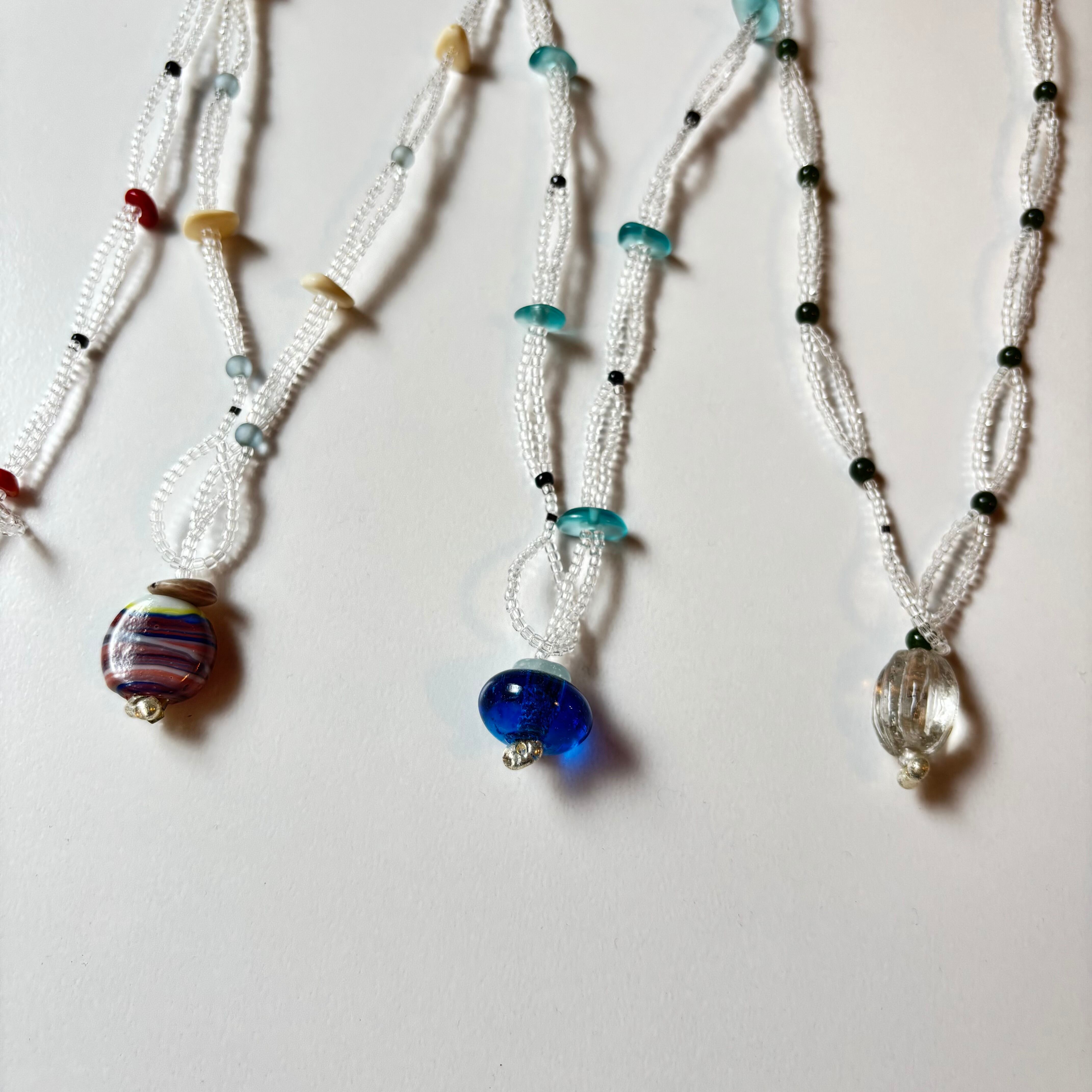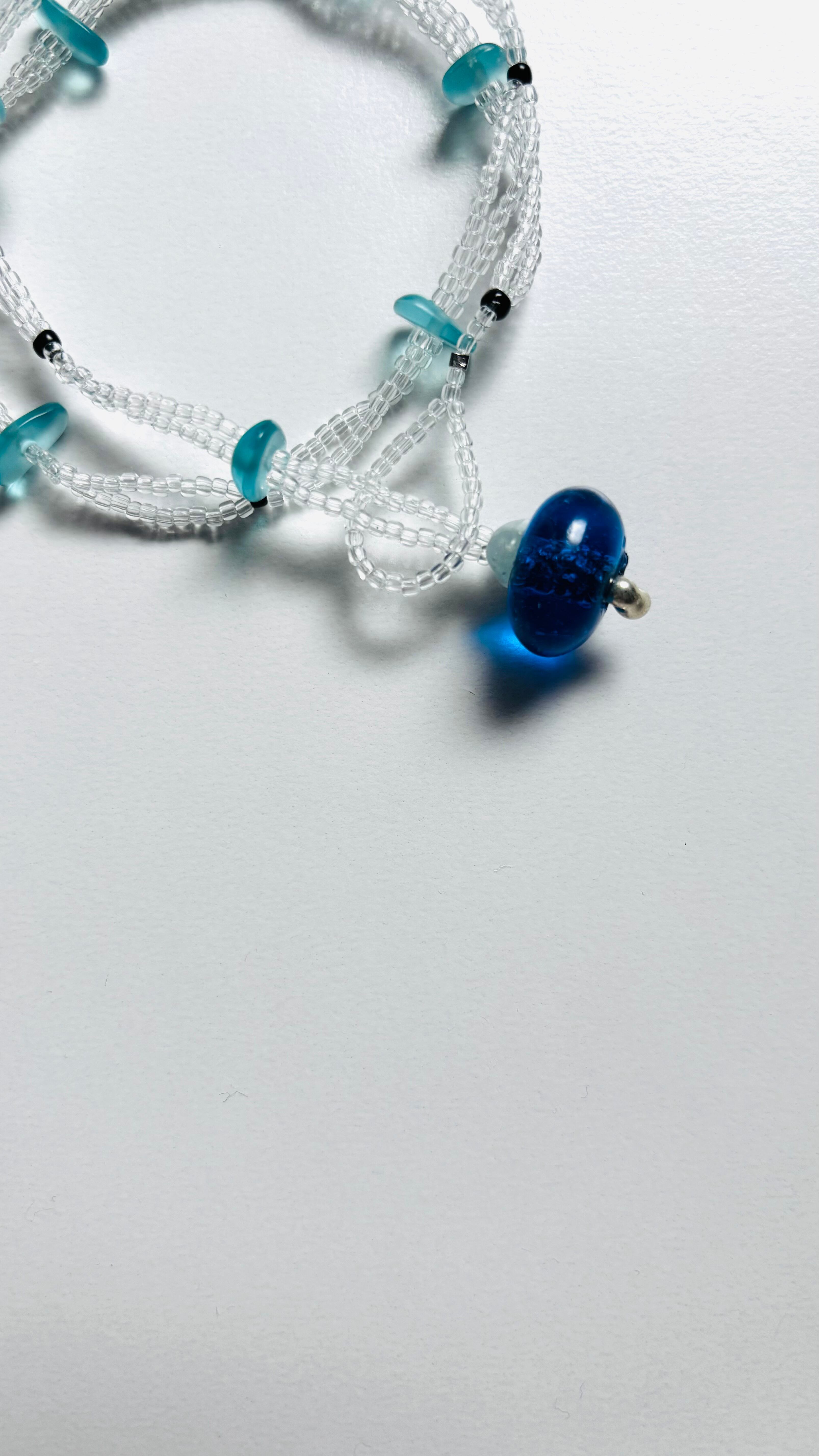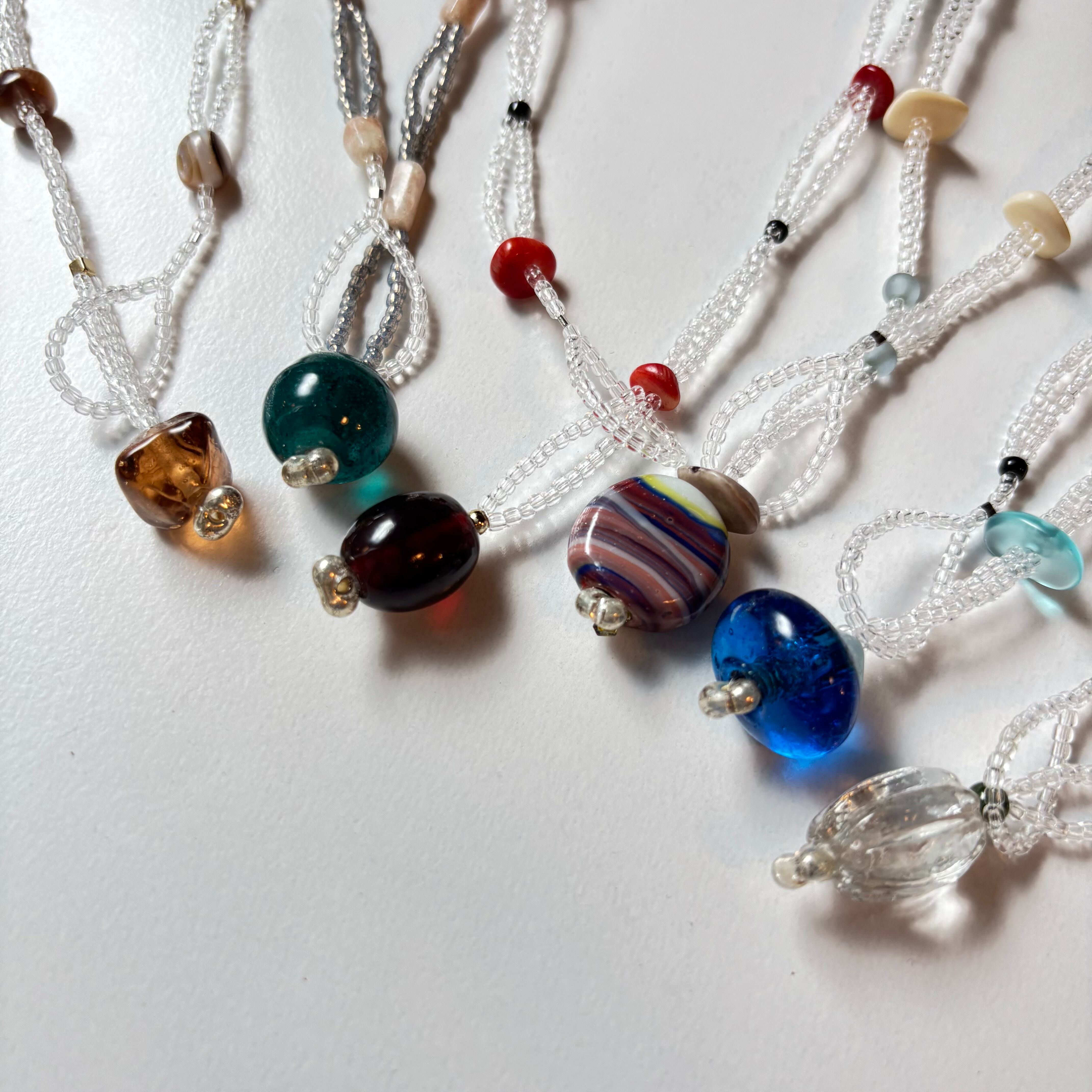メインに使っているビーズはインドやアジアのもので、日本製のクリアなガラスビーズの間にバランスを見て配置しております。丸い穴にトップのビーズを通して着用するので簡単で、トップを後ろに持ってきても後ろ姿が可愛くなるし、前から見ても違ったデザインで楽しんでいただけます。また二重に巻いてブレスレットとしてもお使いください。