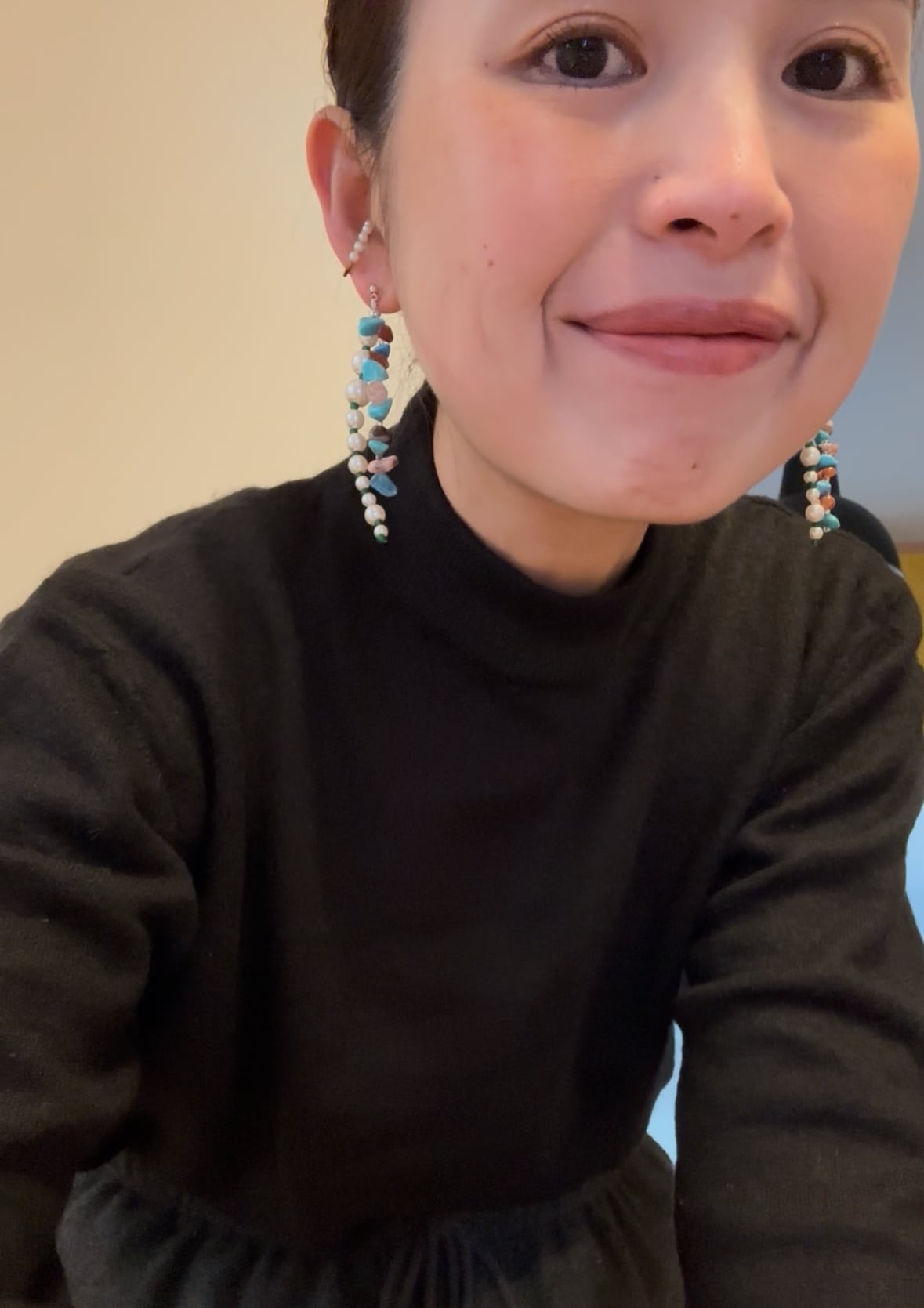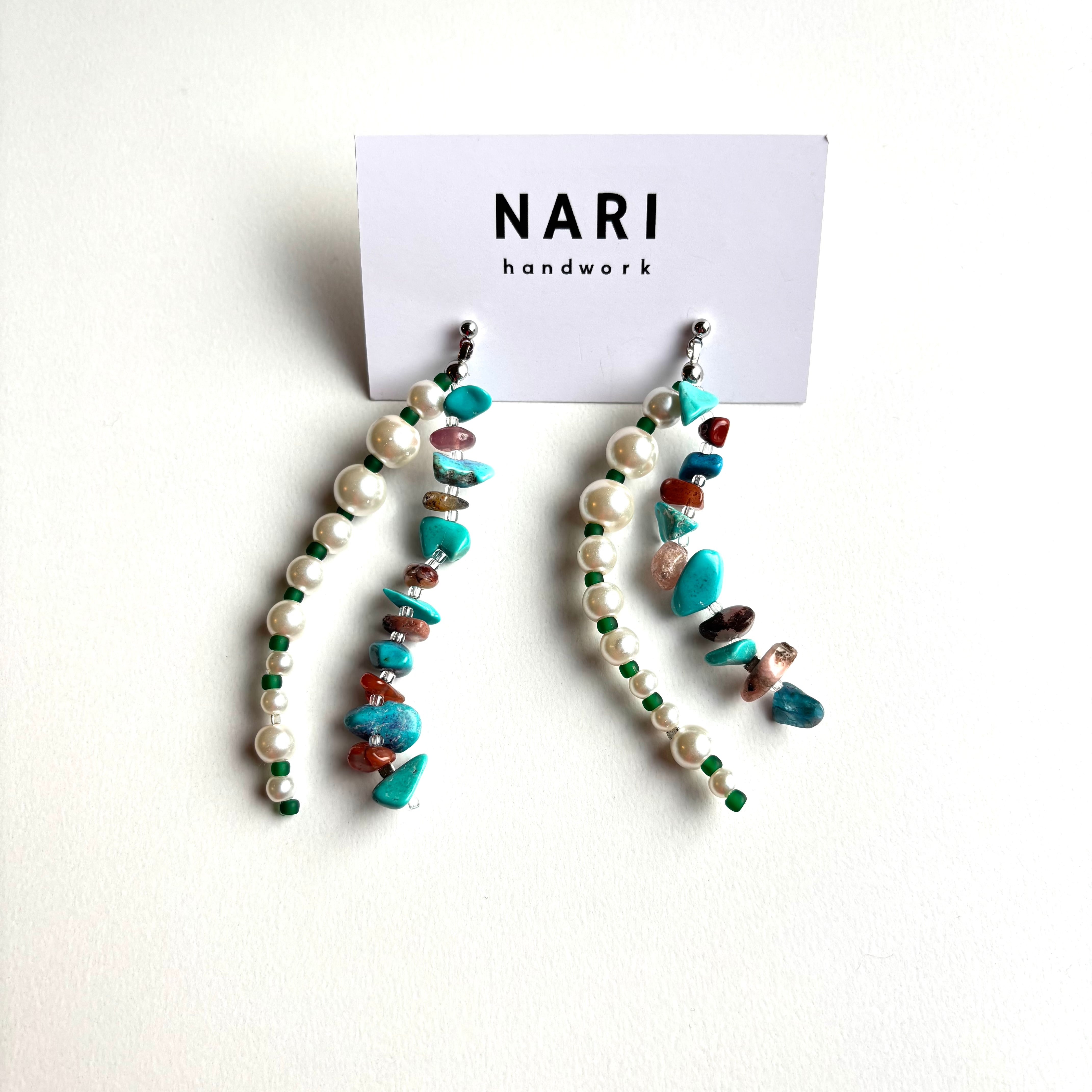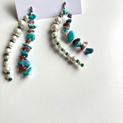 パールと天然石を2連にしたピアスです。 こちらはターコイズカラーになります。冬のターコイズ、意外と可愛いんです。好きな方がいたら嬉しいです♪