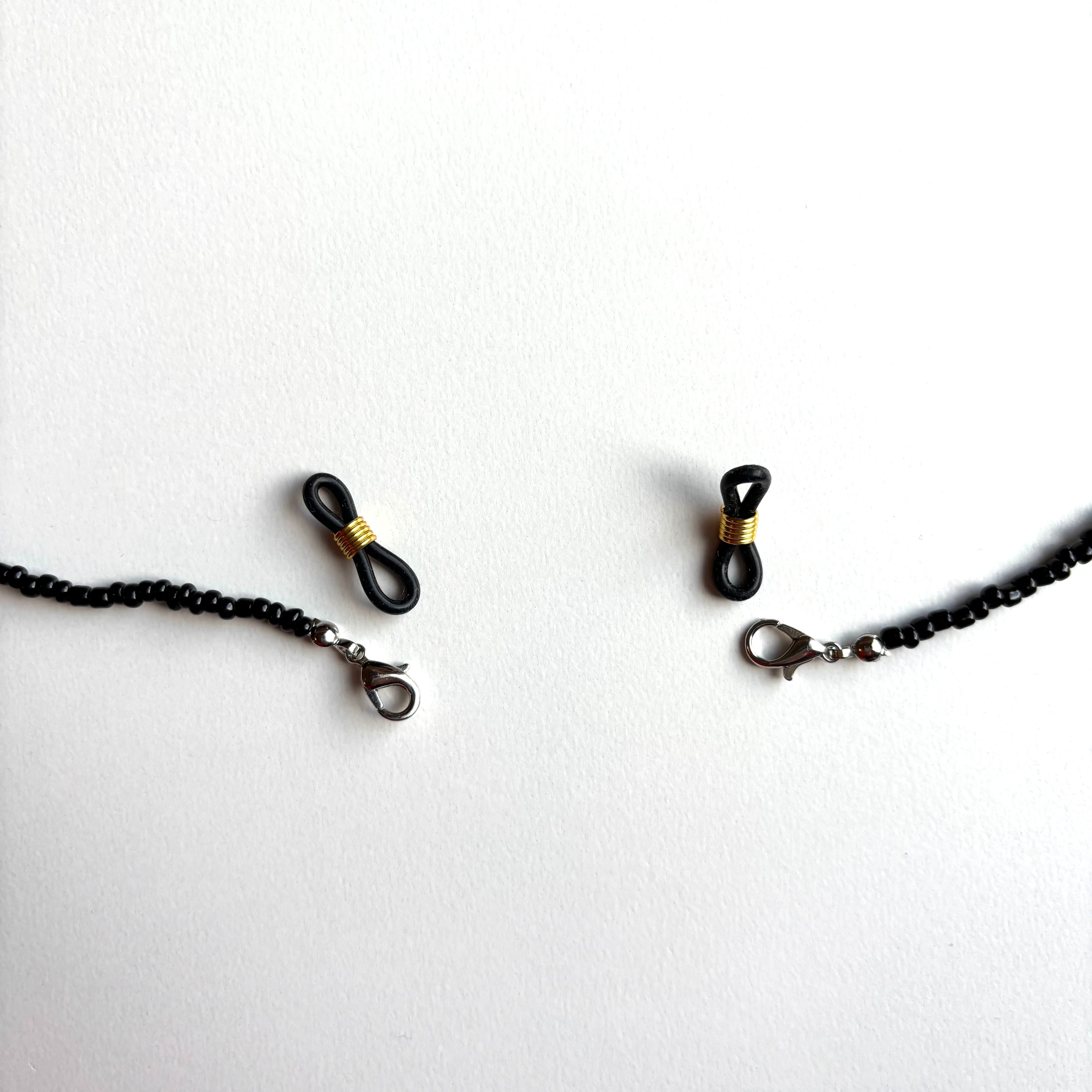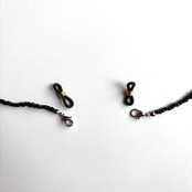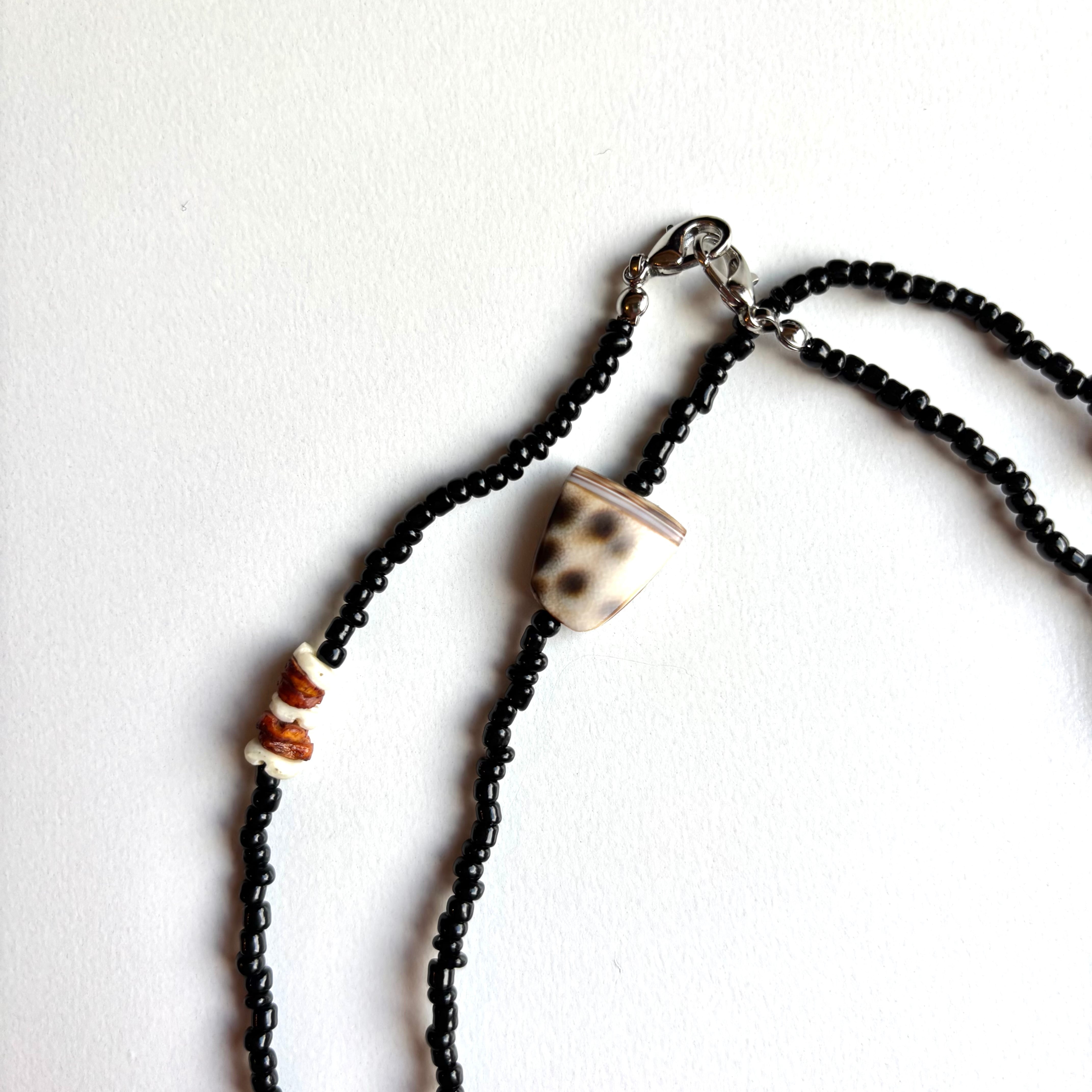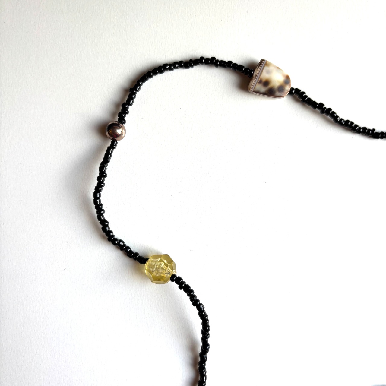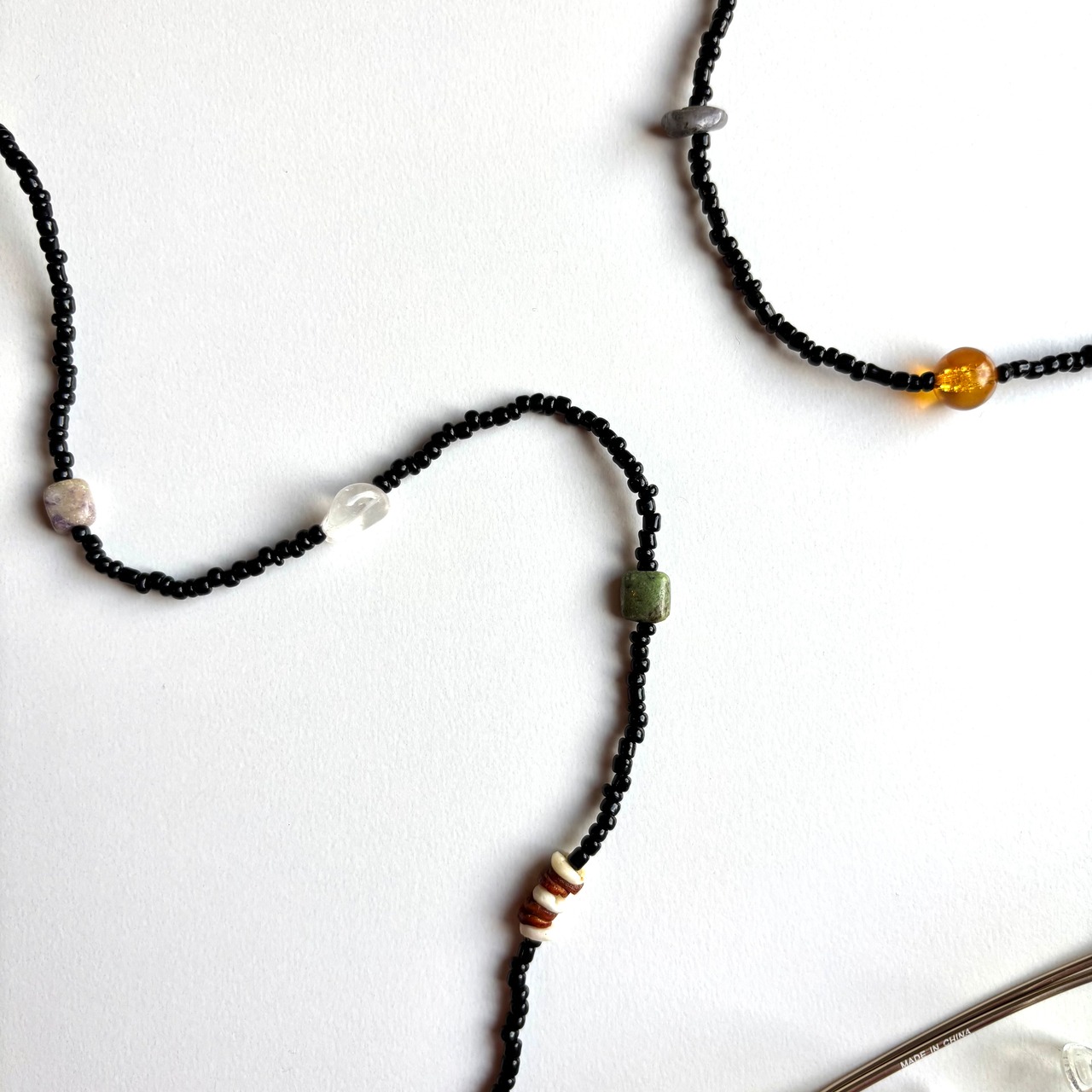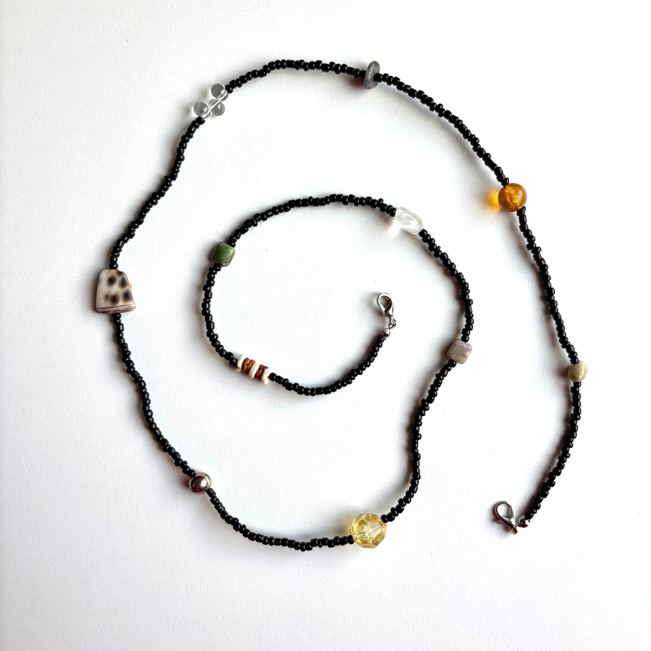 黒のシードビーズの所々にアクセントになるビーズを通しています。