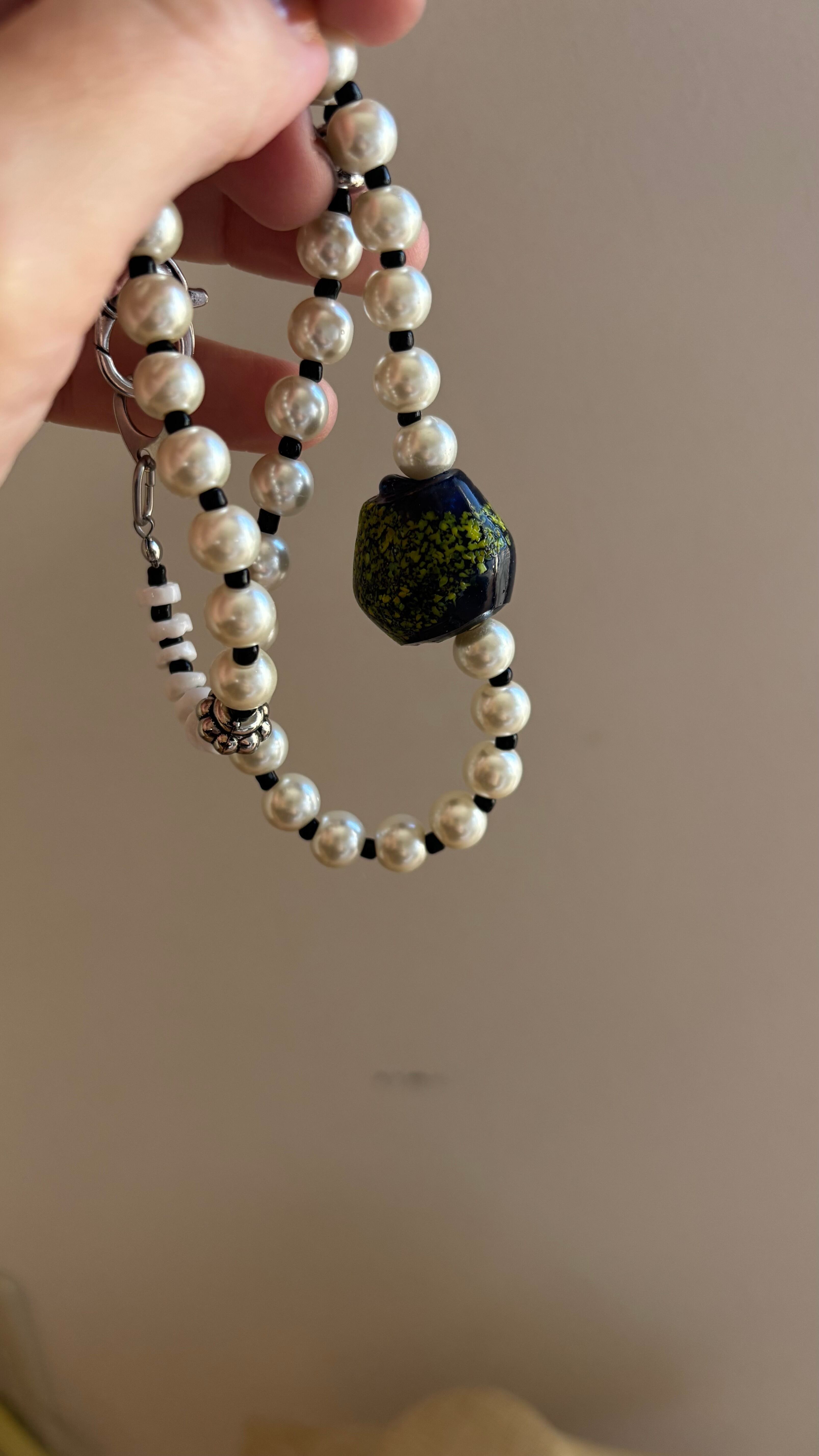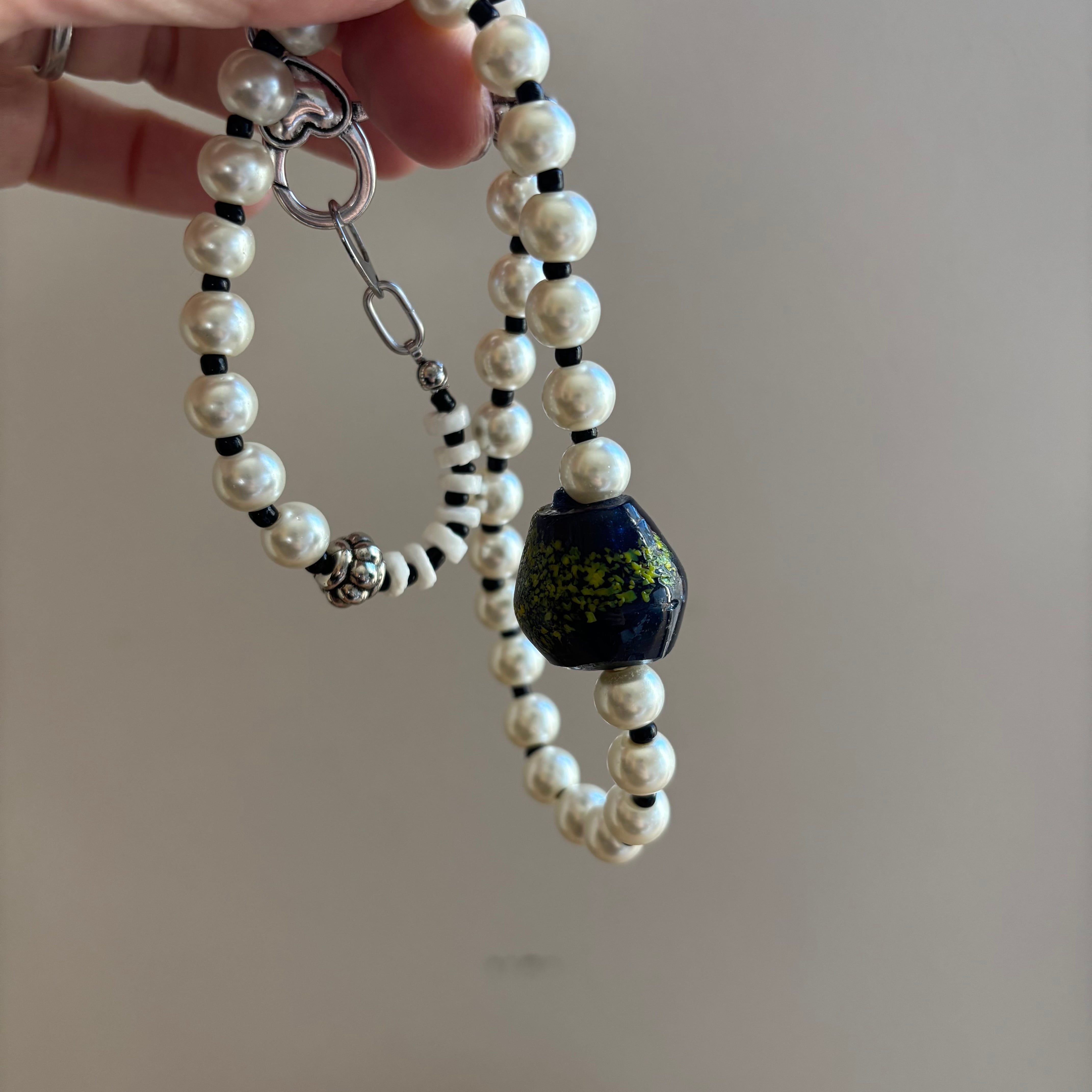 デザインはシンプルめですが、深海のような限りなく黒に近いブルーのビーズがお守りになってくれるような、そんなネックレスに仕上がりました。