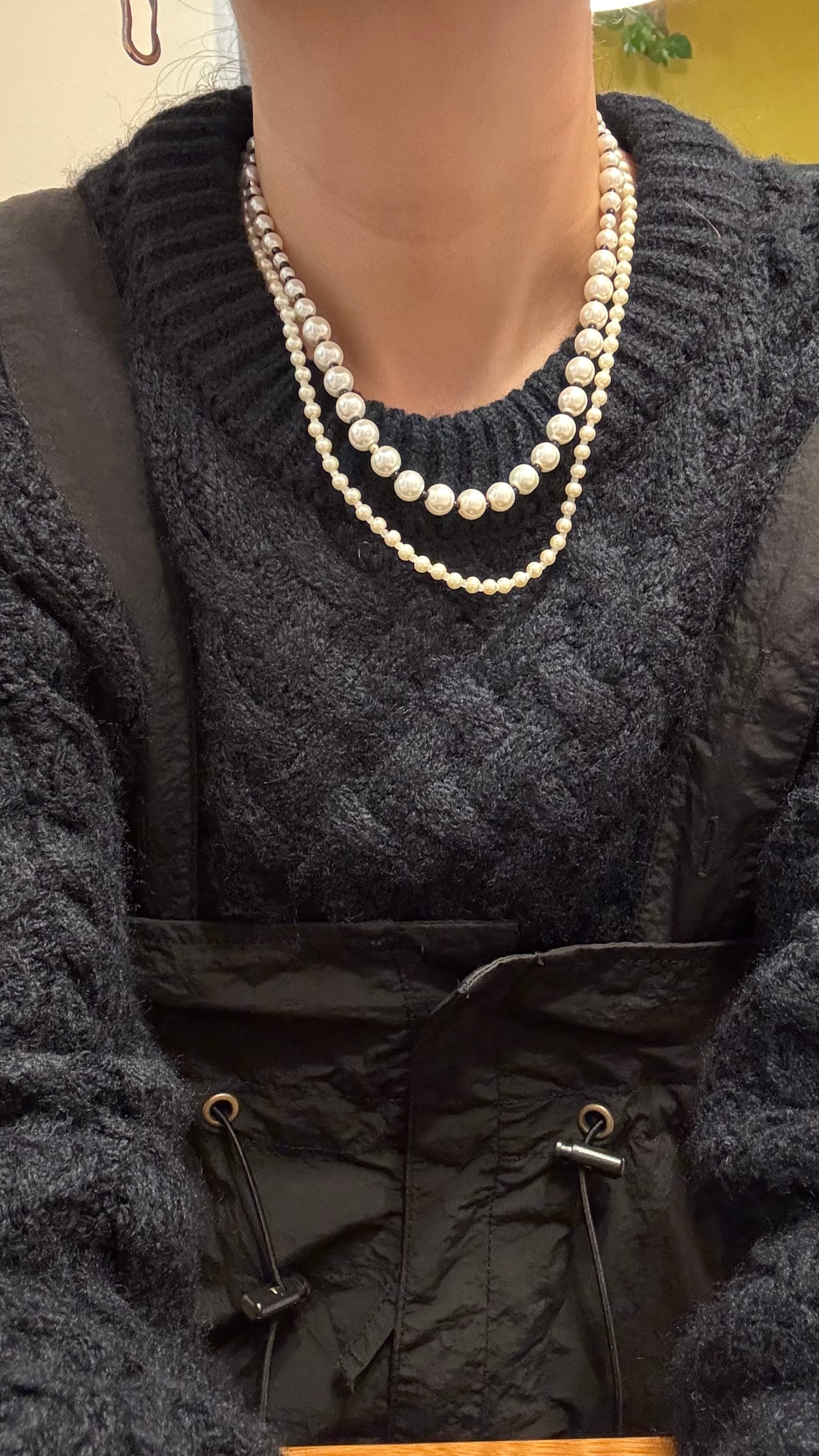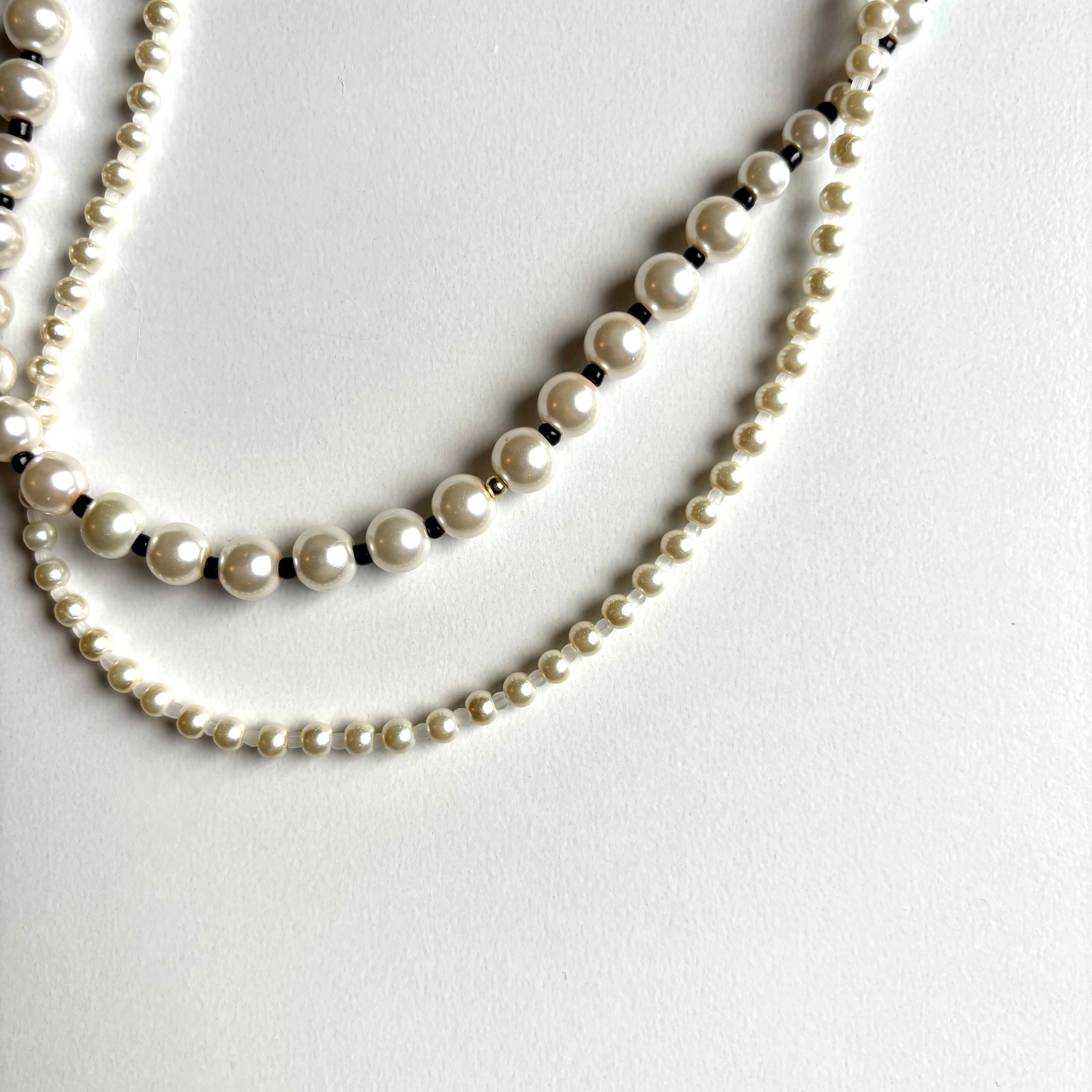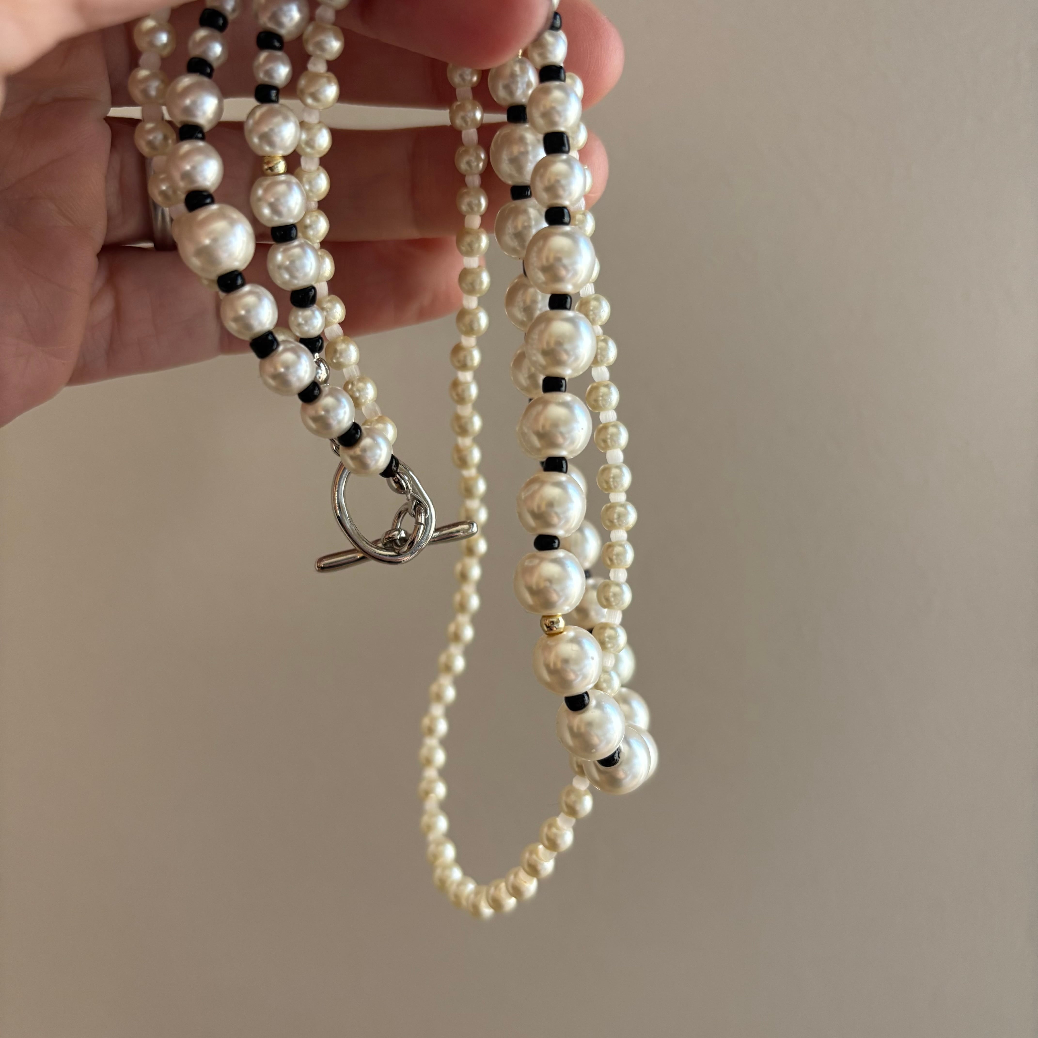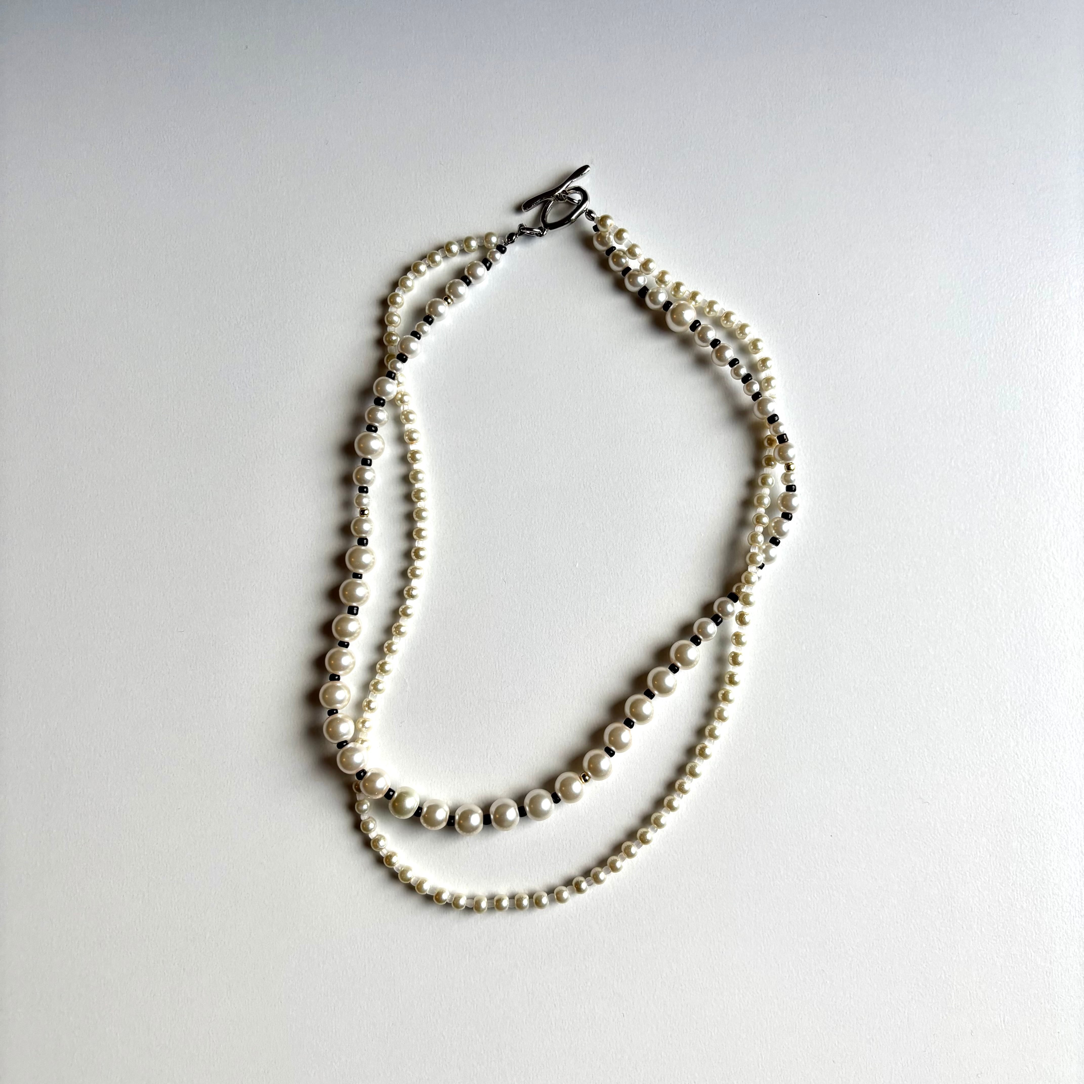 大きさいろいろなパールネックレスを2連着けているようなデザインのネックレスです。