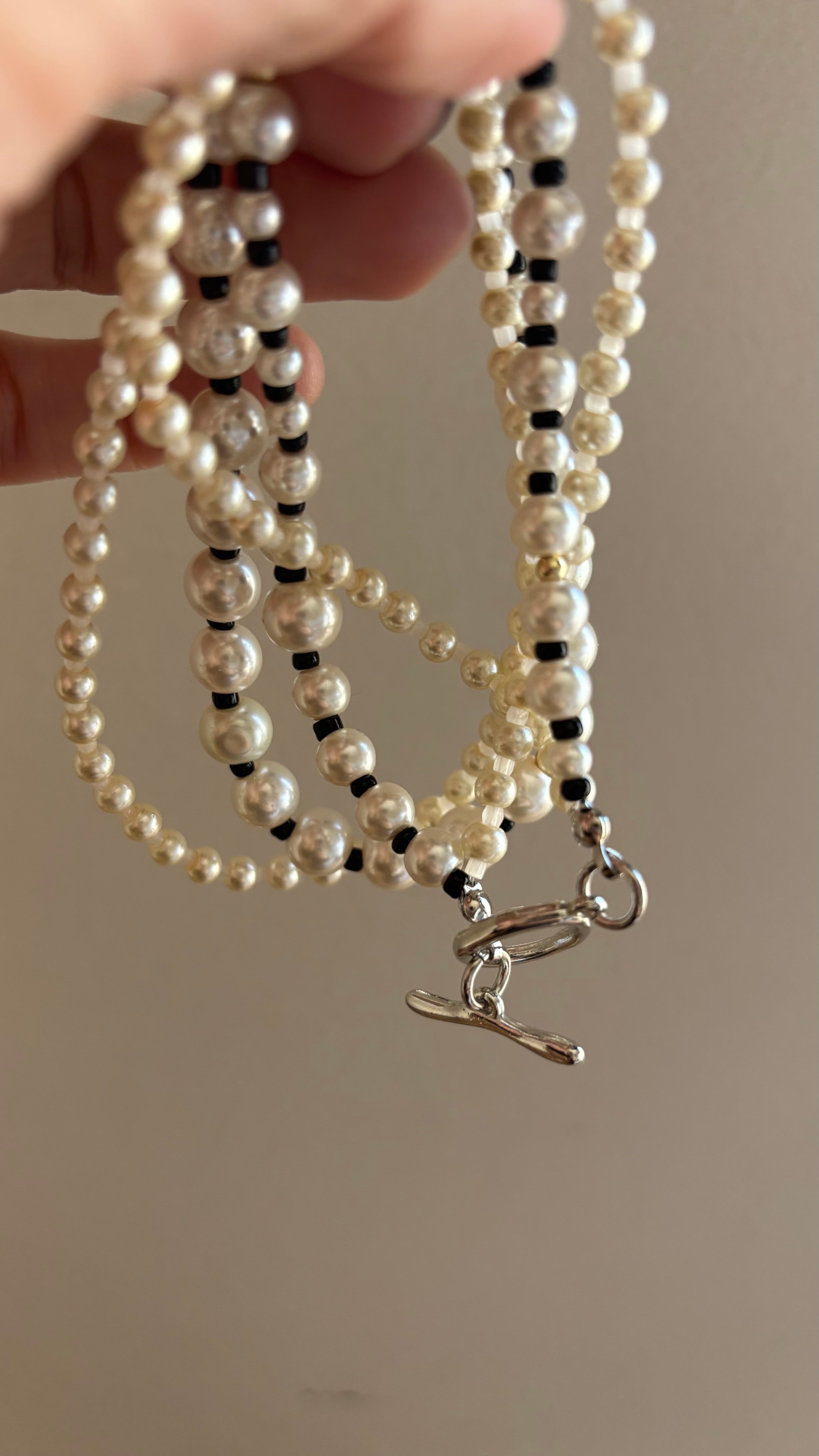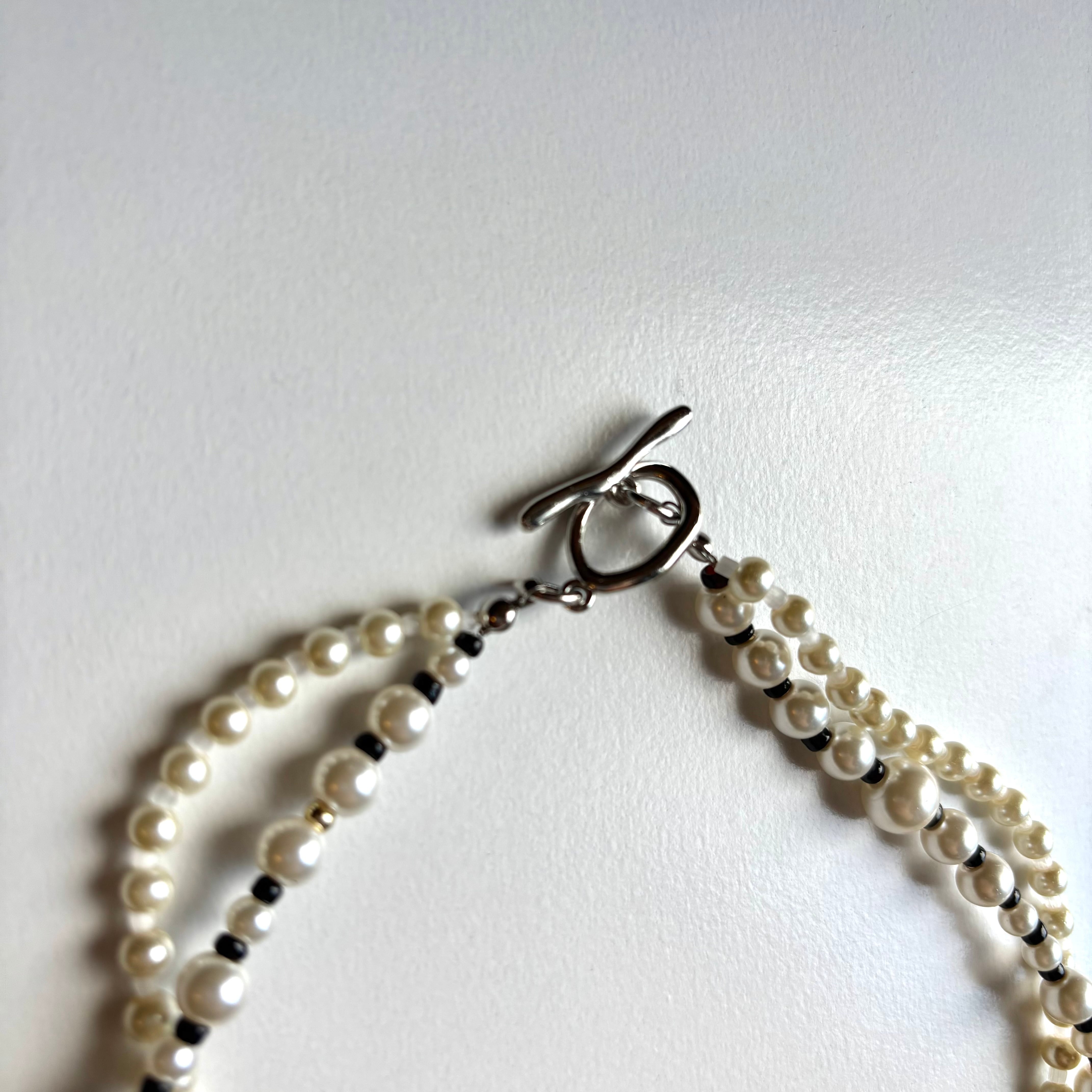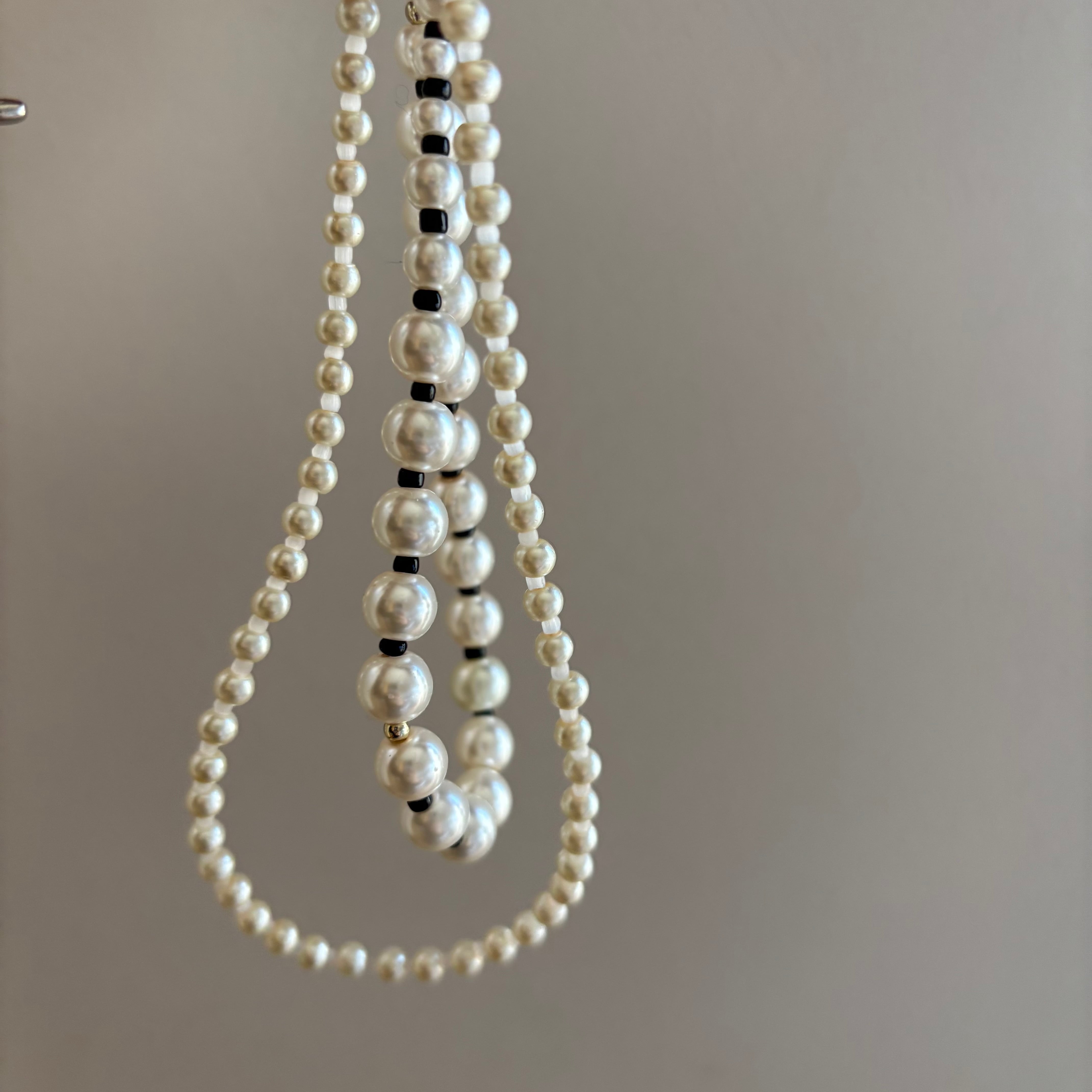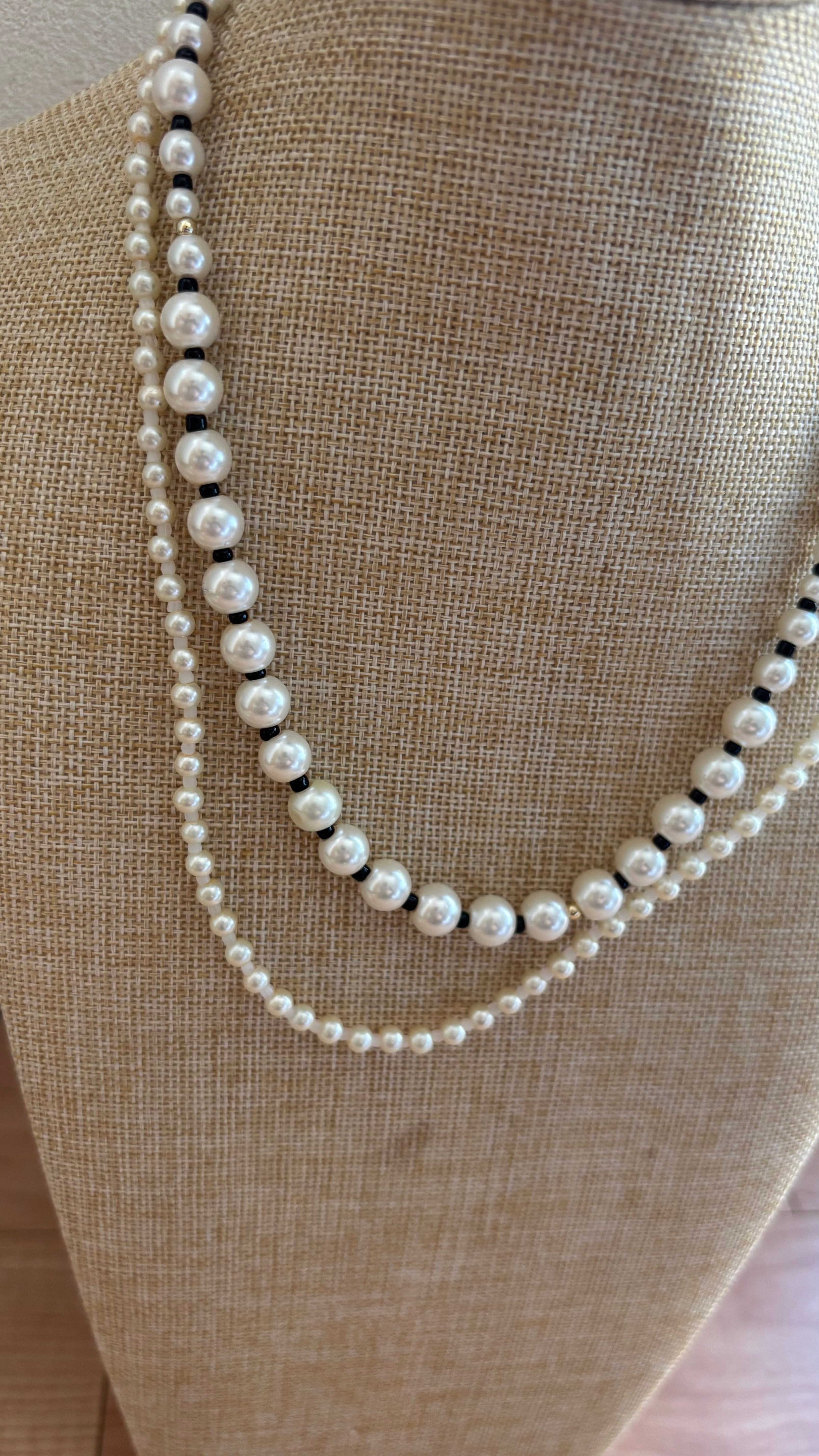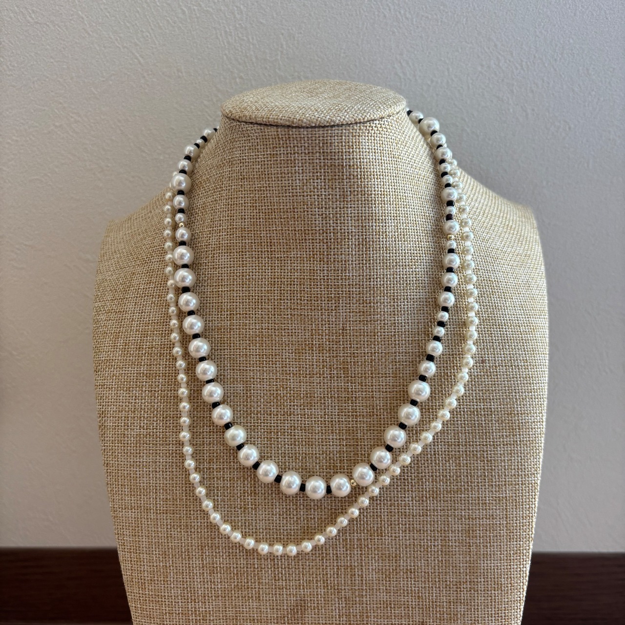 大きさいろいろなパールネックレスを2連着けているようなデザインのネックレスです。