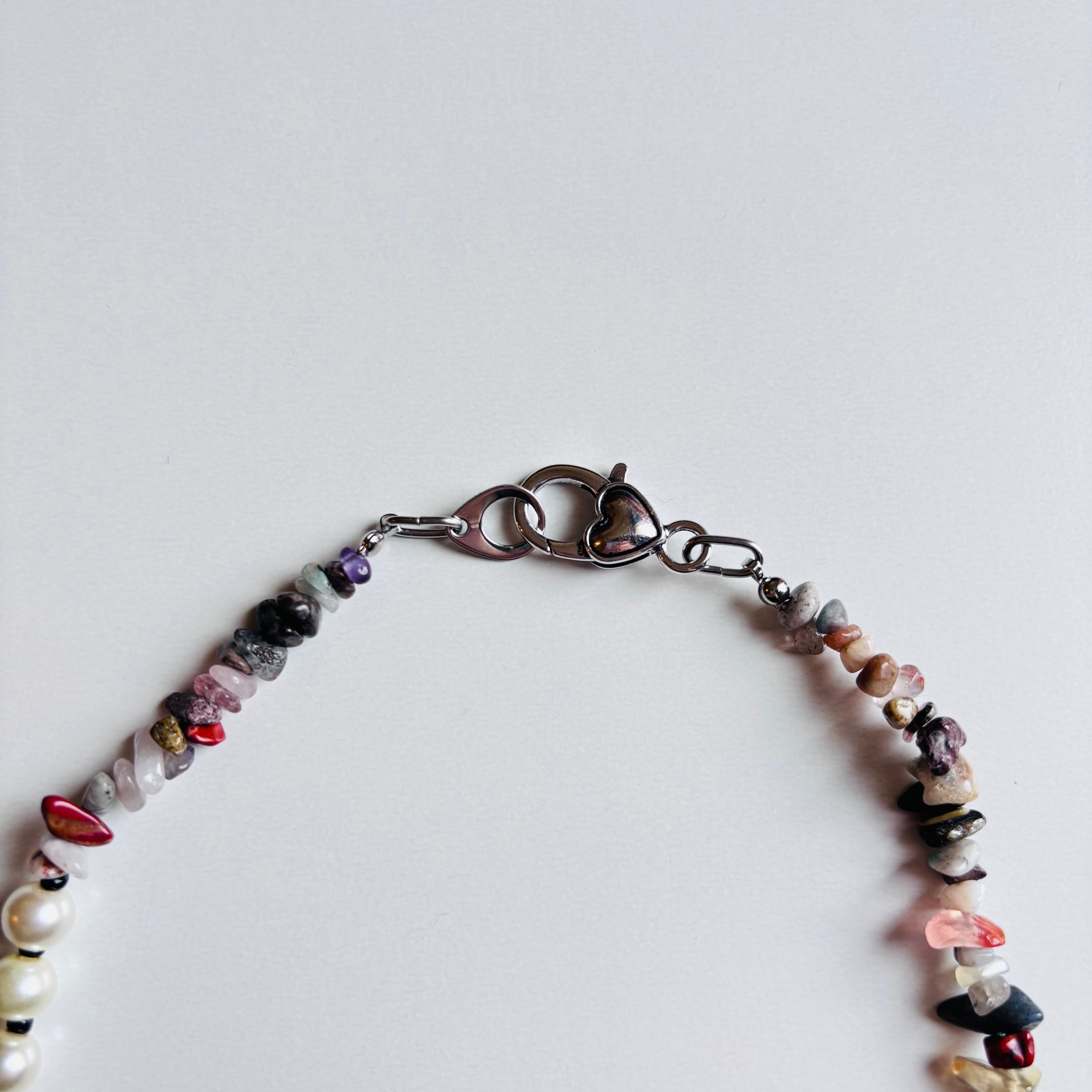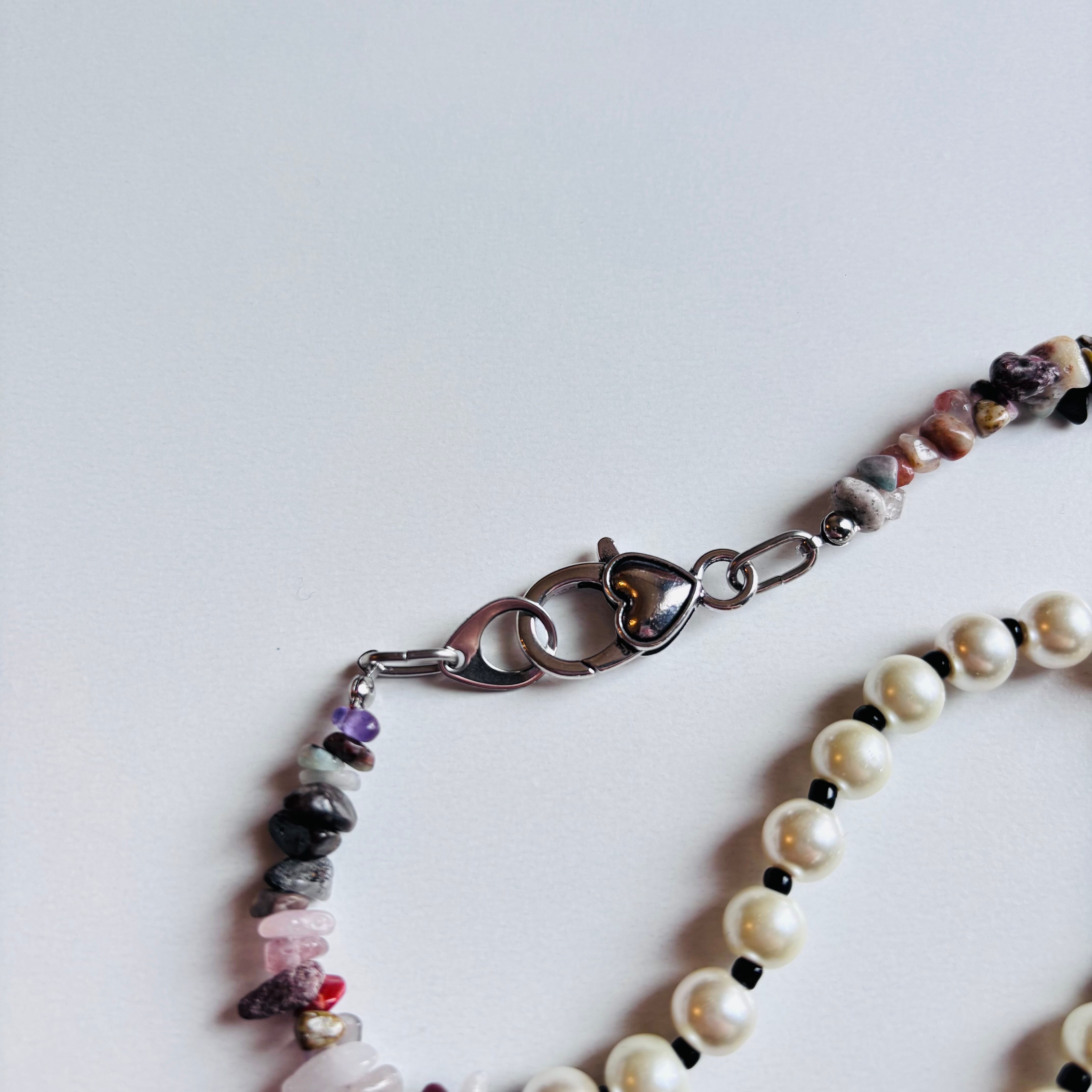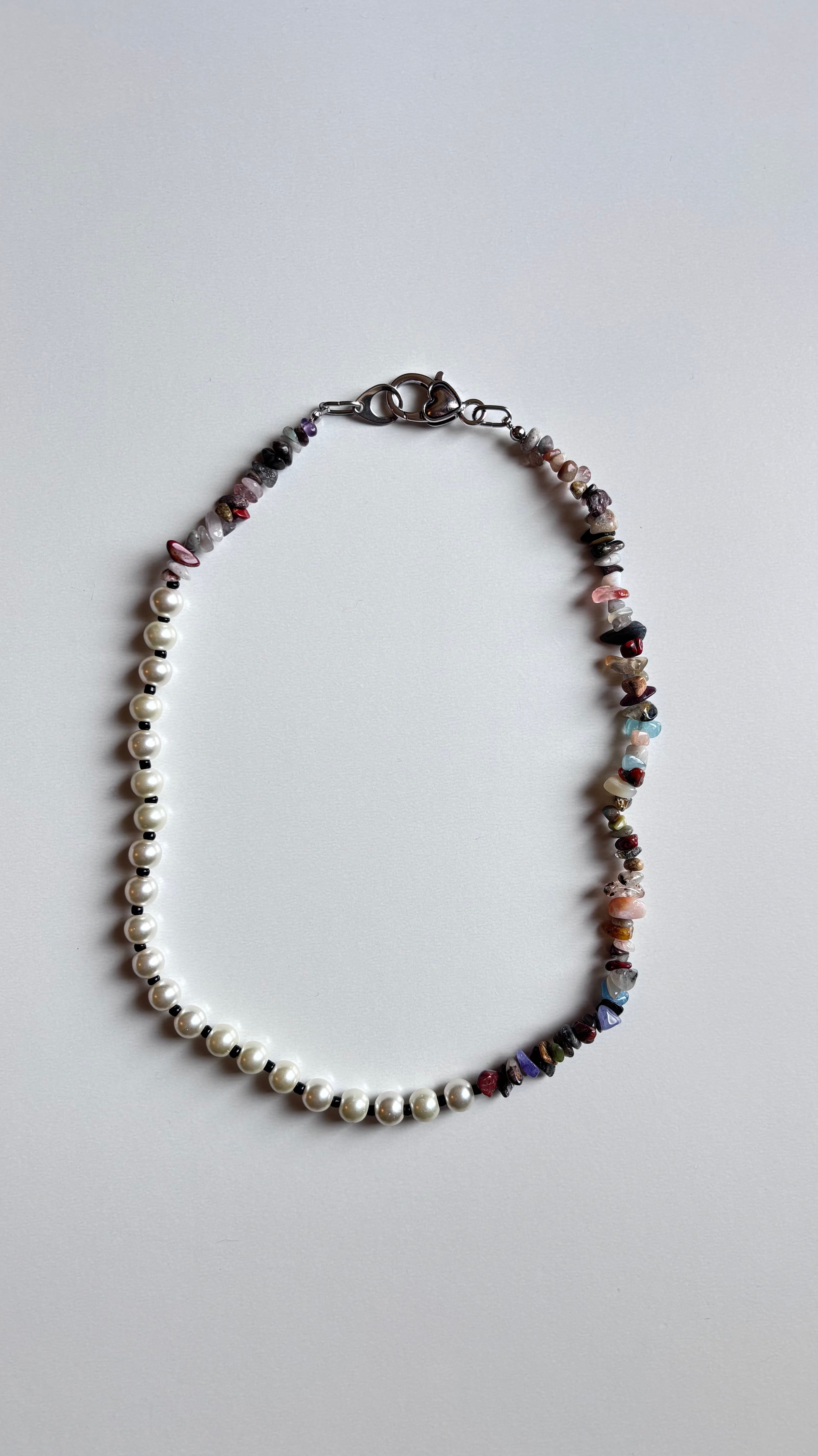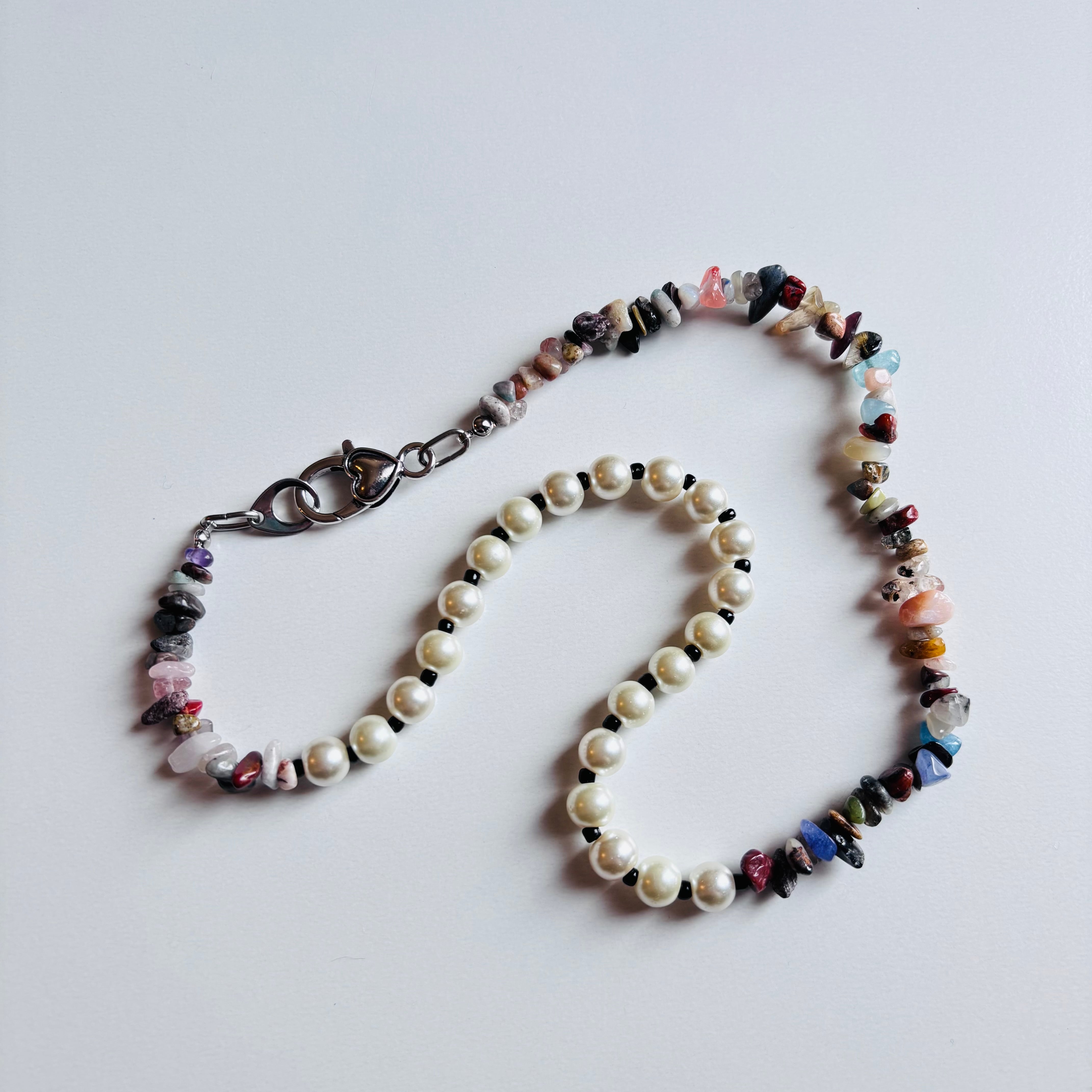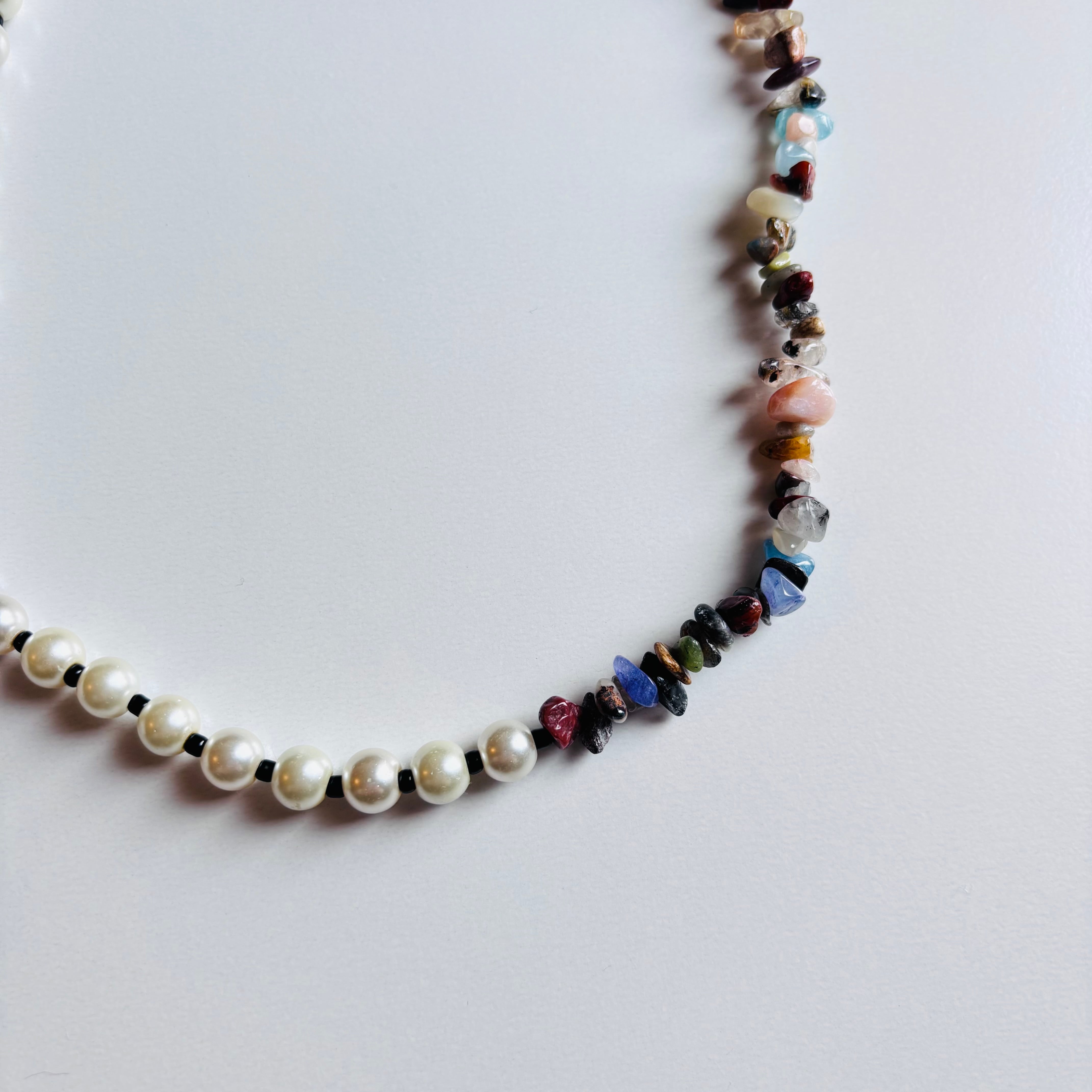 天然石とパールを組み合わせた、日常でもおめかしにも使えてアクセントになってくれるネックレスです。主張しすぎず、かといって地味でもないので世代や服装問わず幅広い方におすすめしたいアイテムです。