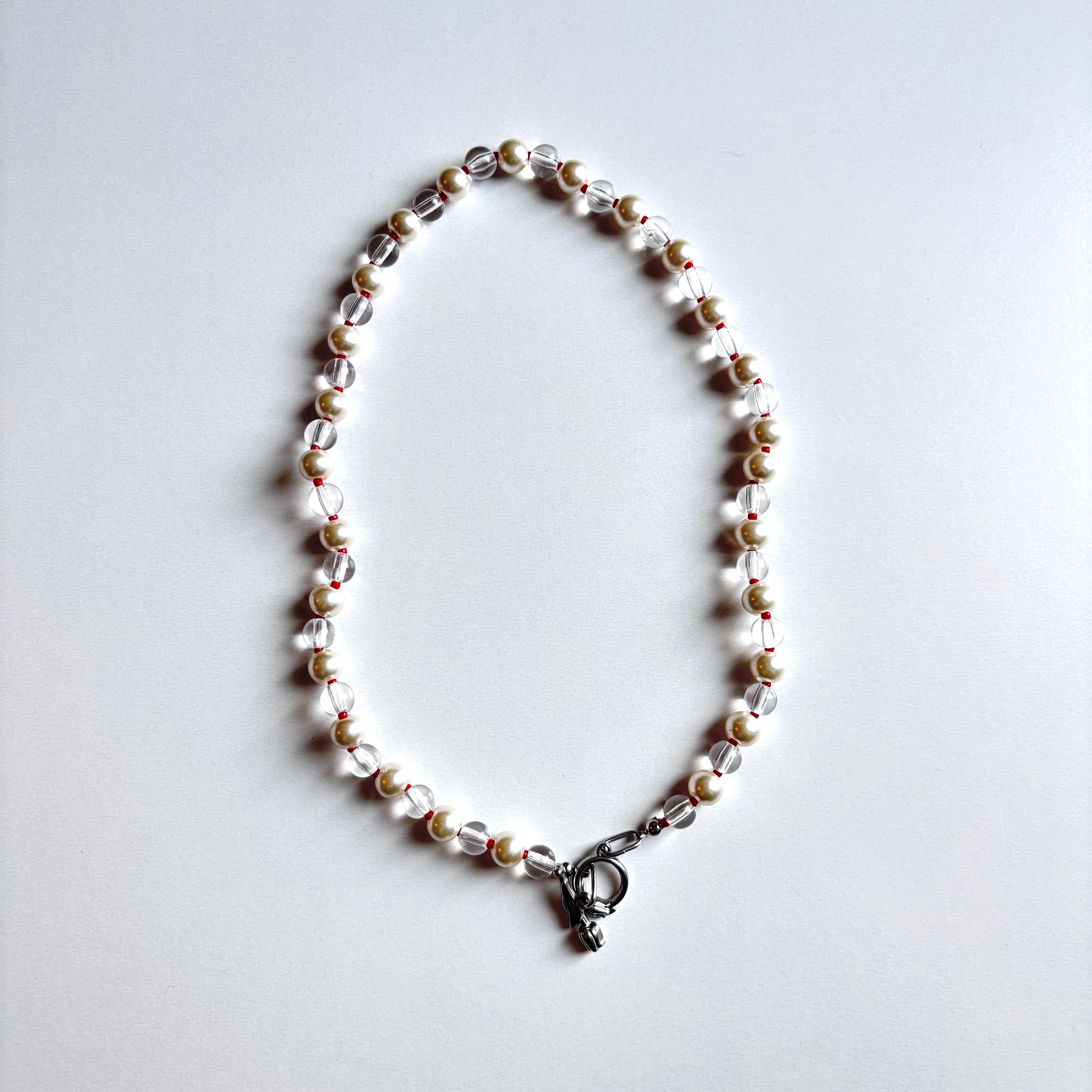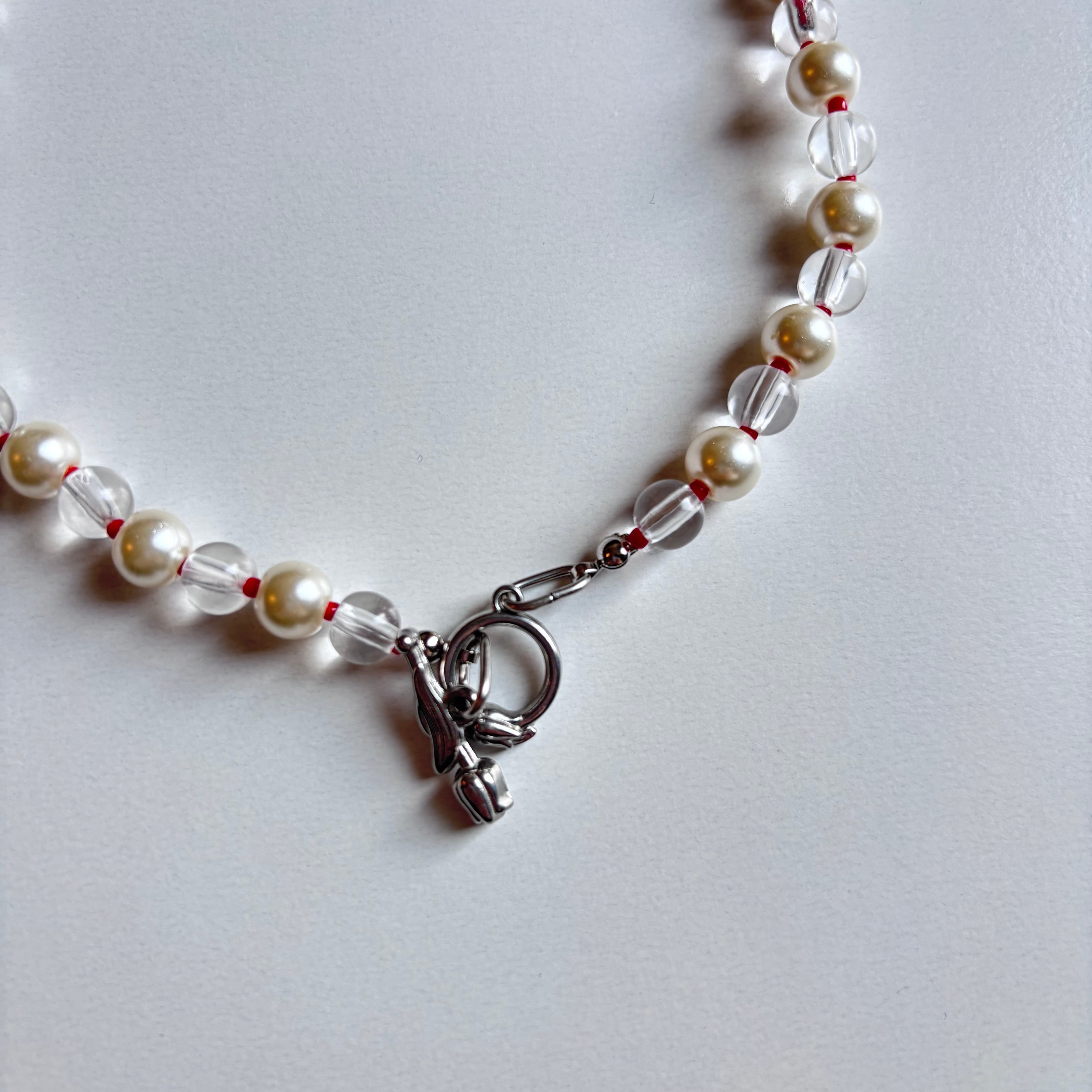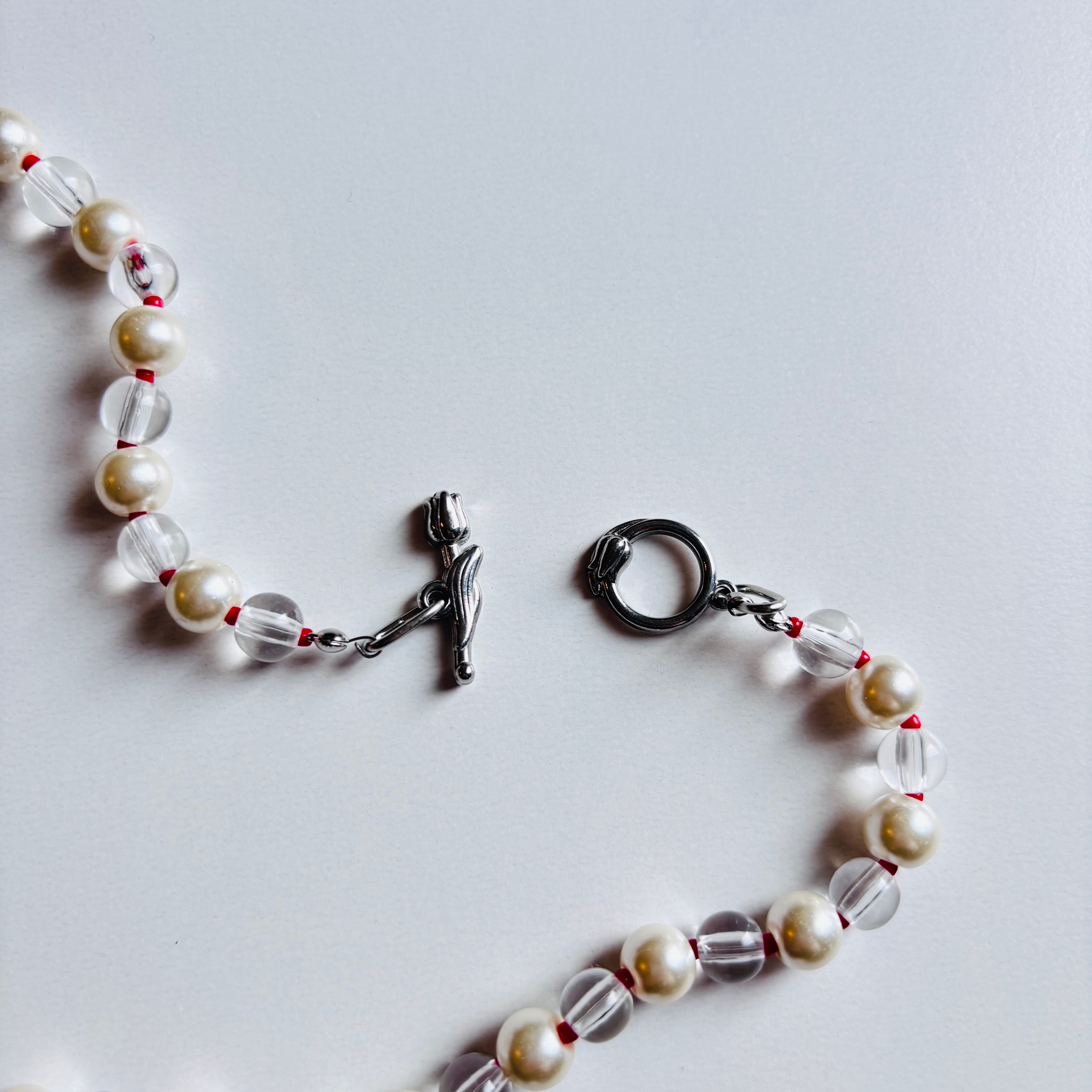 「春が待ち遠しいあなたへ♪」のイメージで作った パールネックレスです。チューリップの留め具が前にきてもかわいいのでお好きな着け方で楽しんでください。