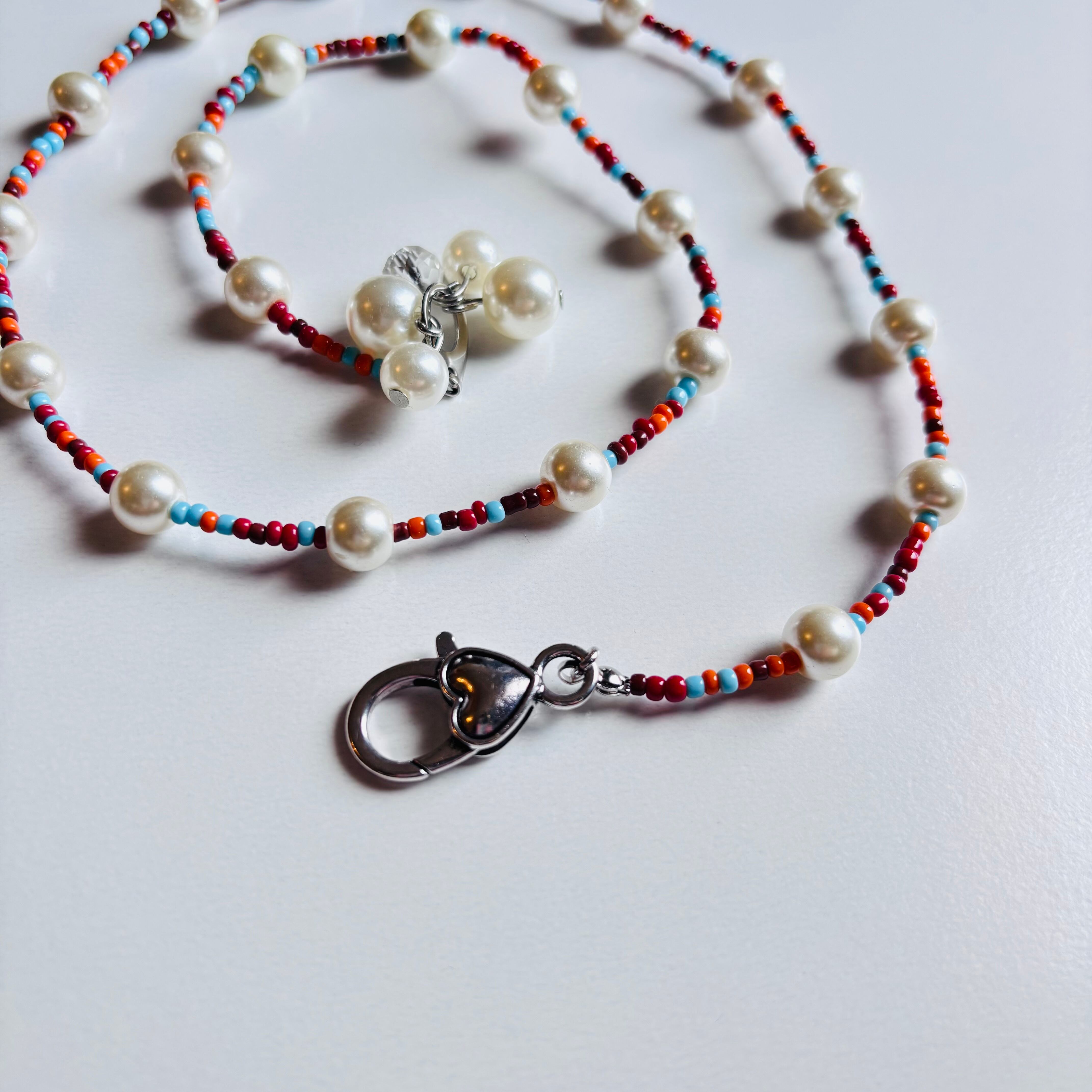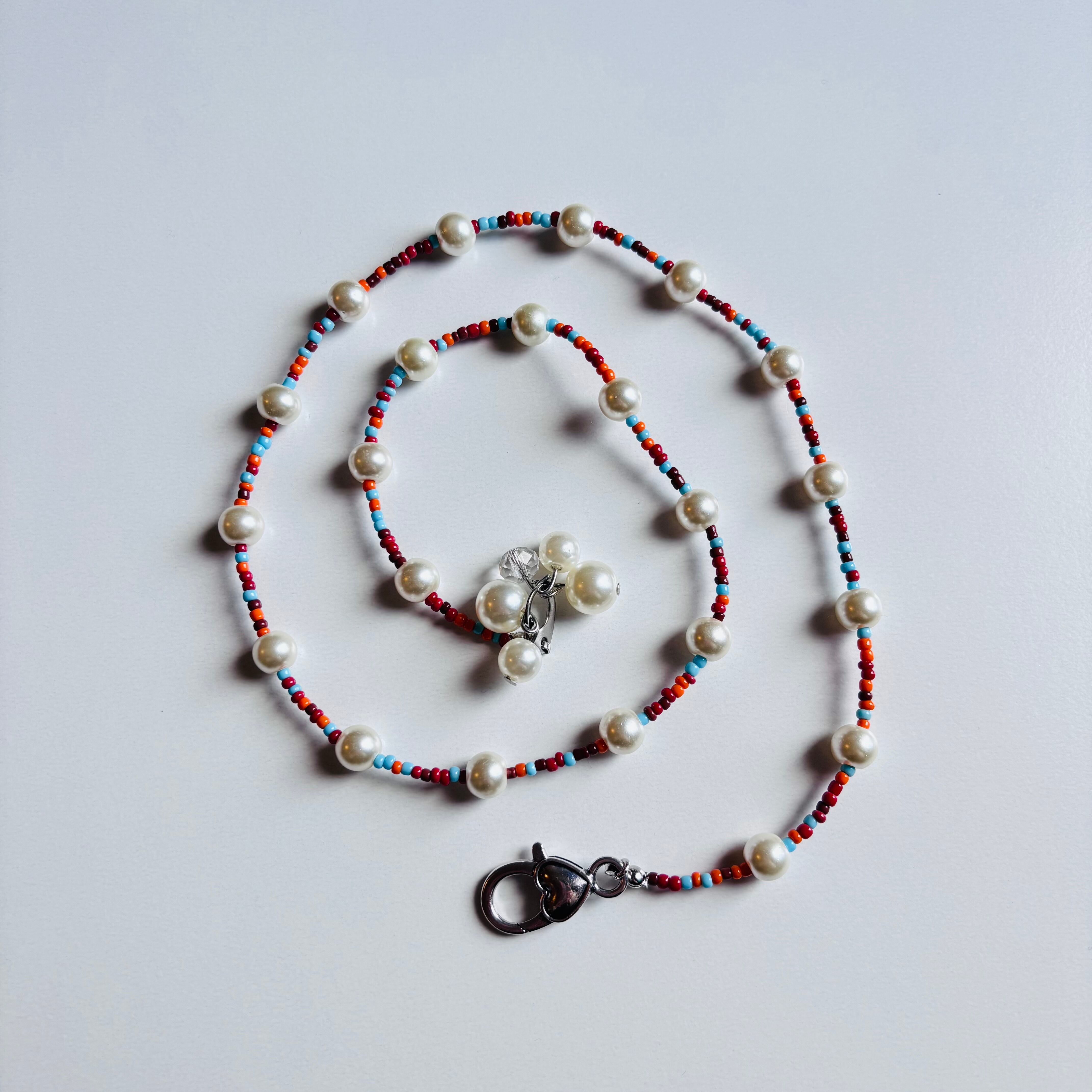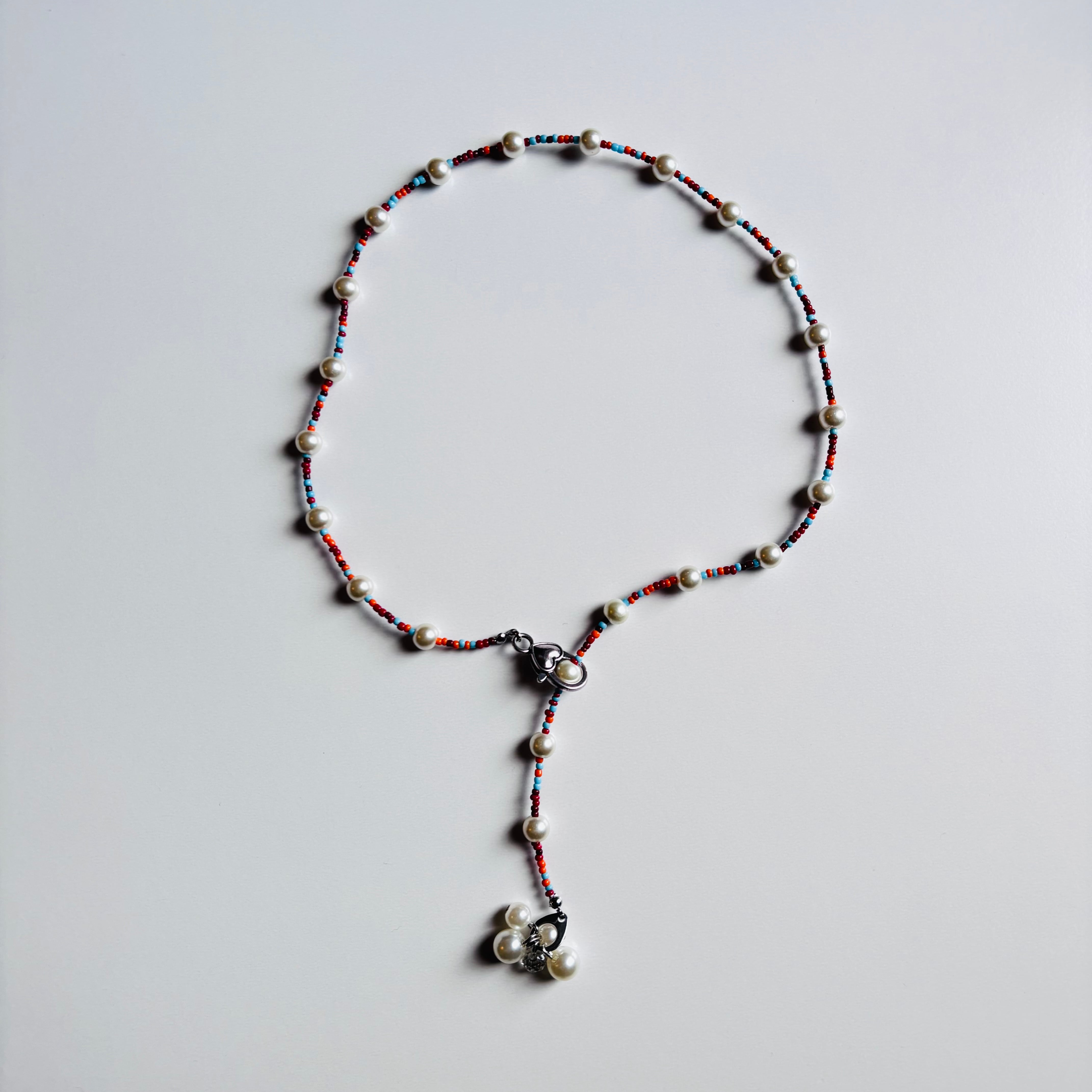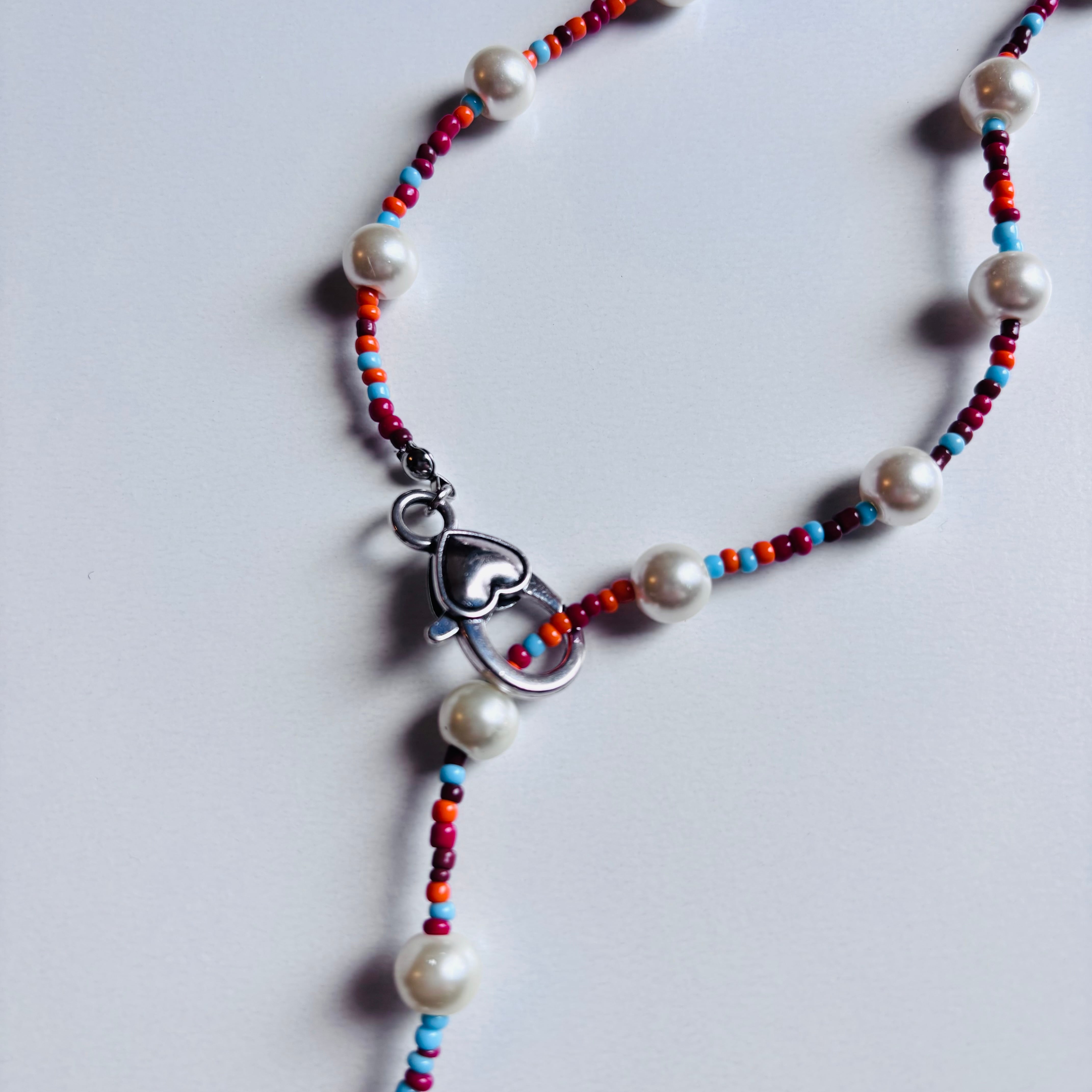 古着のカレッジTやスウェットに合いそうな配色のビーズとパールをMIXさせたロングネックレスです。金具が好きな位置でとめられる仕様なので、好みの所でとめて気分に合わせて楽しんでみてください。