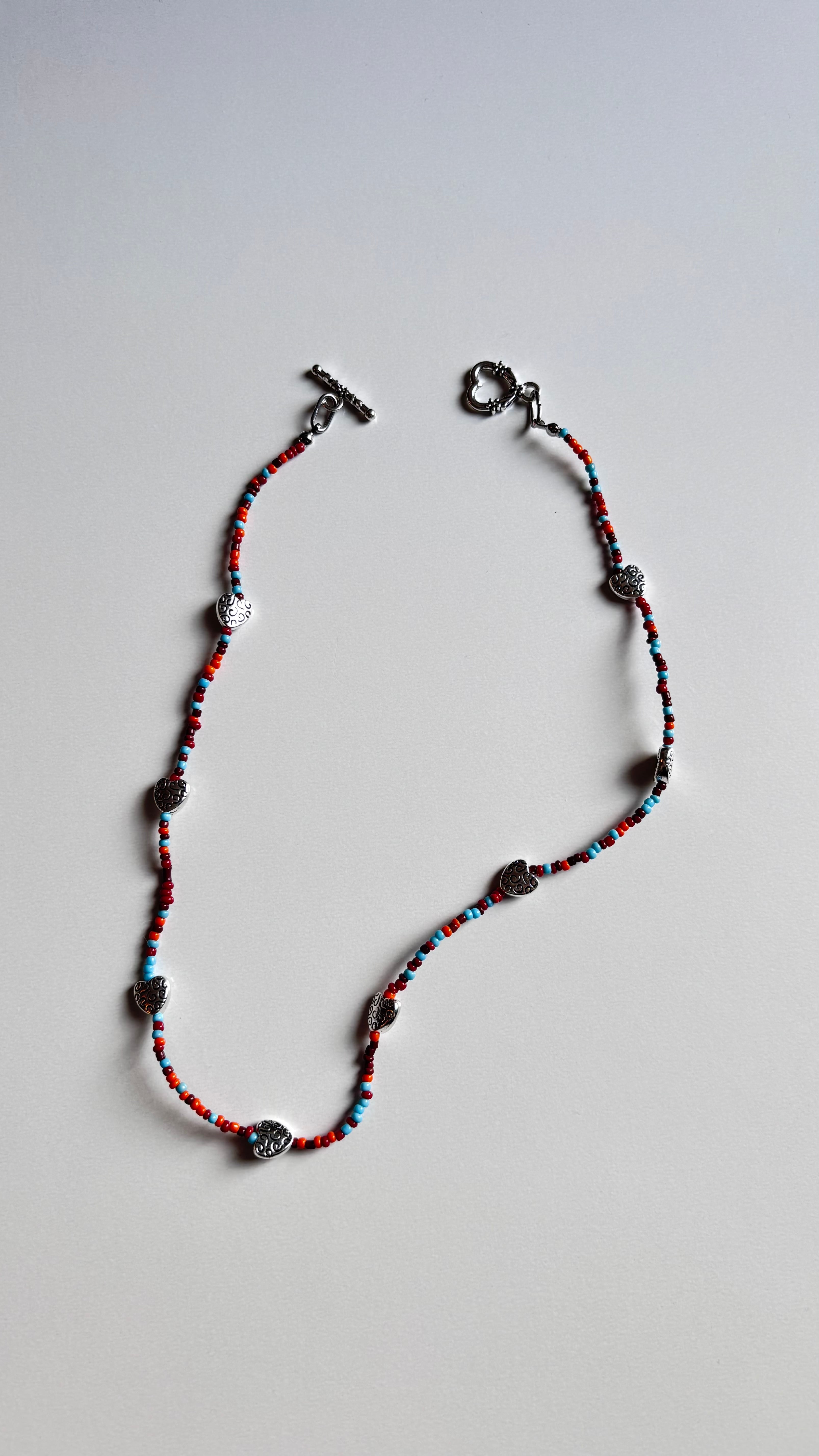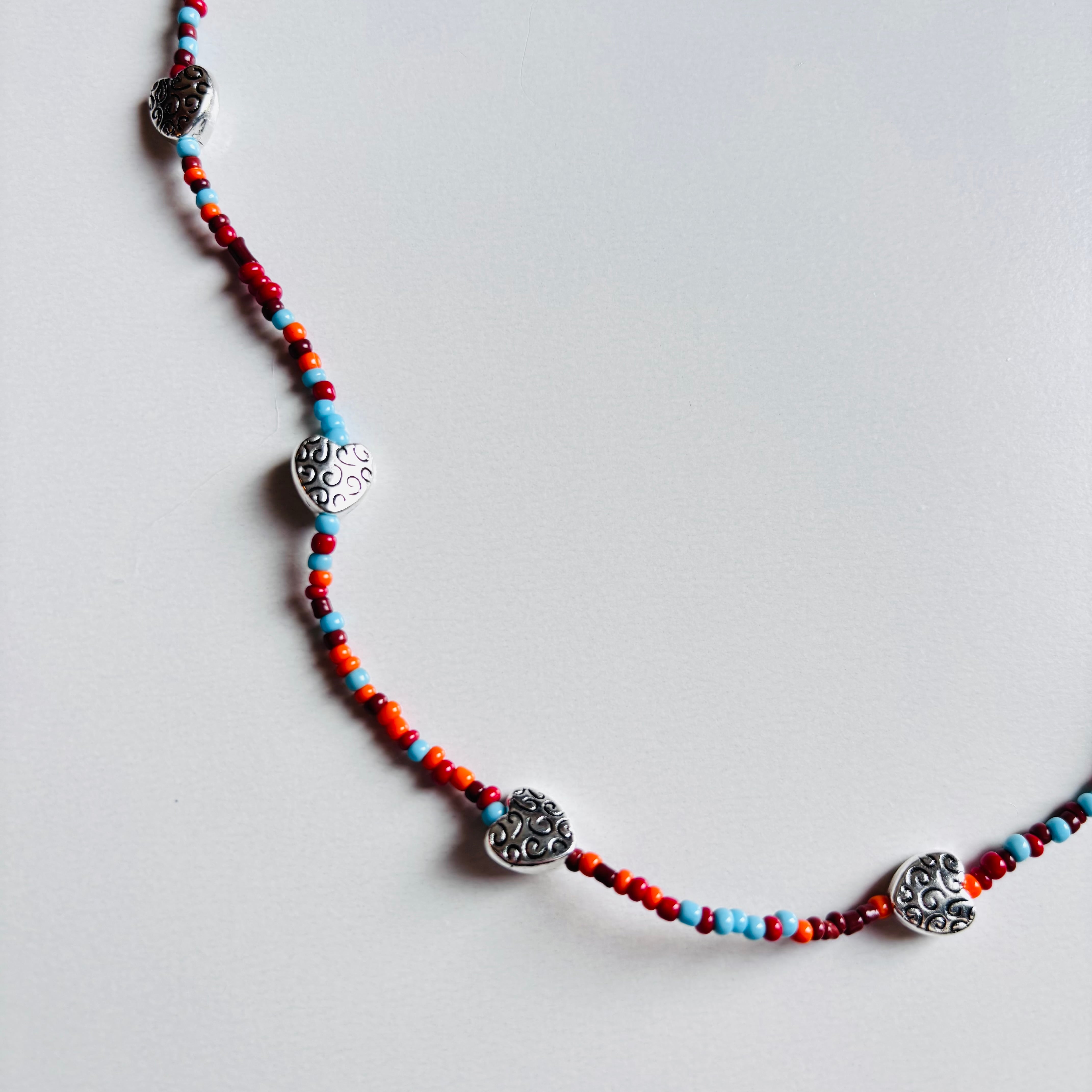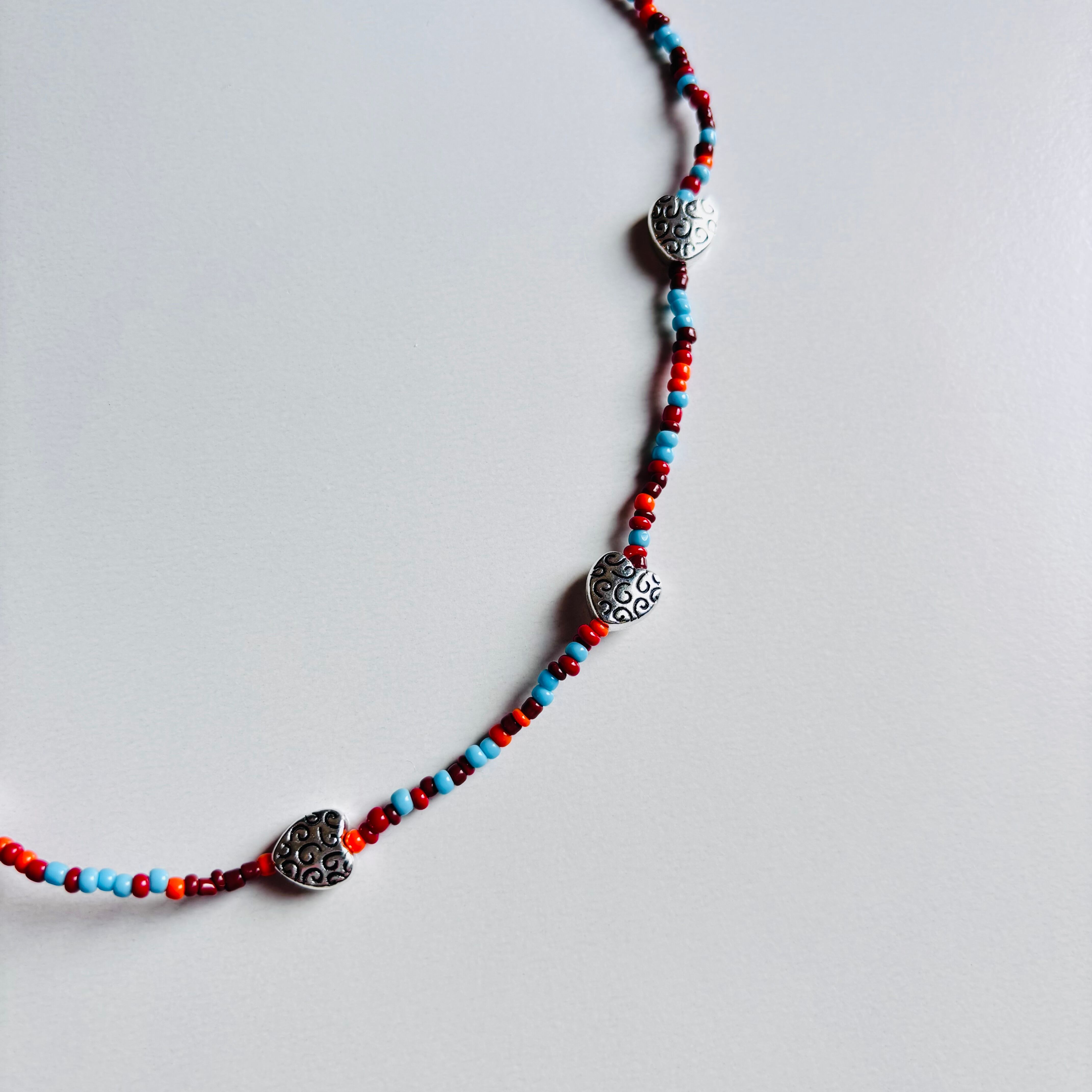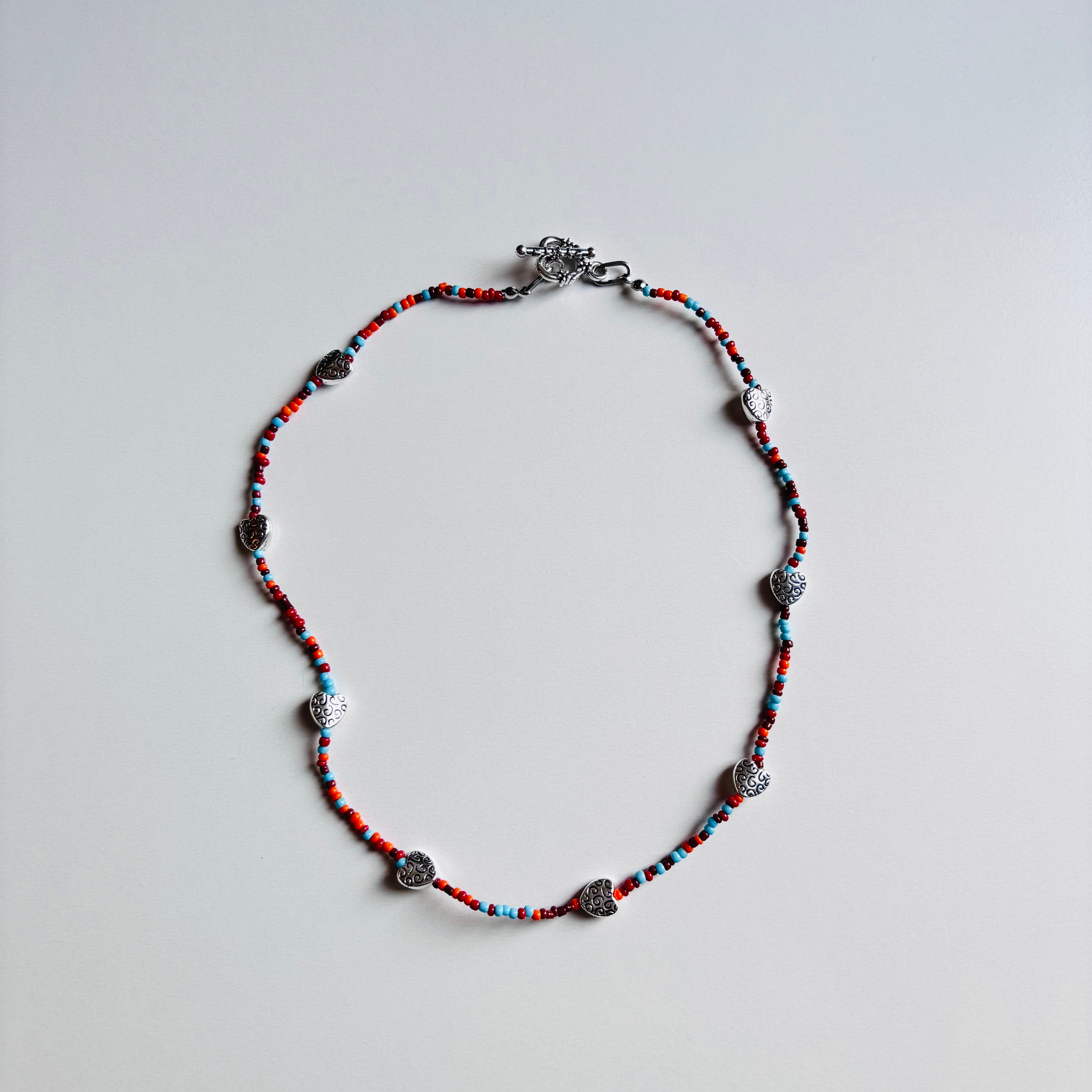 可愛くなりすぎないハートのネックレスを作りました。シルバーのハートパーツや留め具もハートとハートづくしだけど、キュートすぎずむしろかっこよく使っていただけるかと思います。長さがあえば腕にぐるぐる巻いてブレスレットとしてもお使いいただけます。